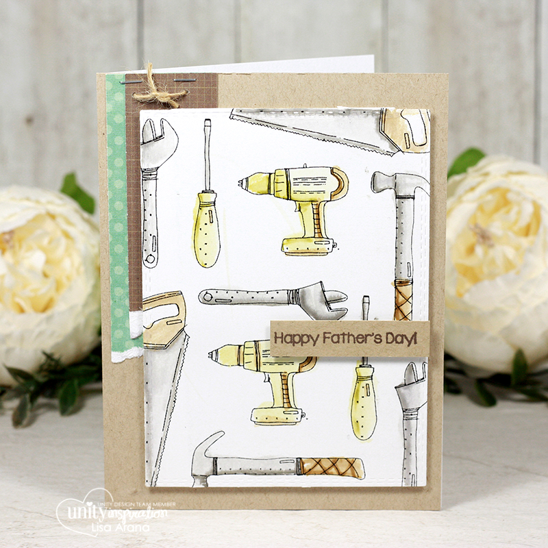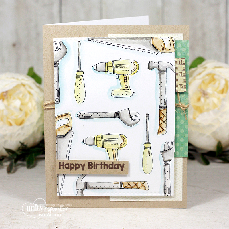 For this card, I stamped the tools all lined up in a row. Then I used Distress Markers to color them in. I stamped on regular 80 lb cardstock, so I kept the water to a minimum. I only used a few colors, so it was quick to color these images in.