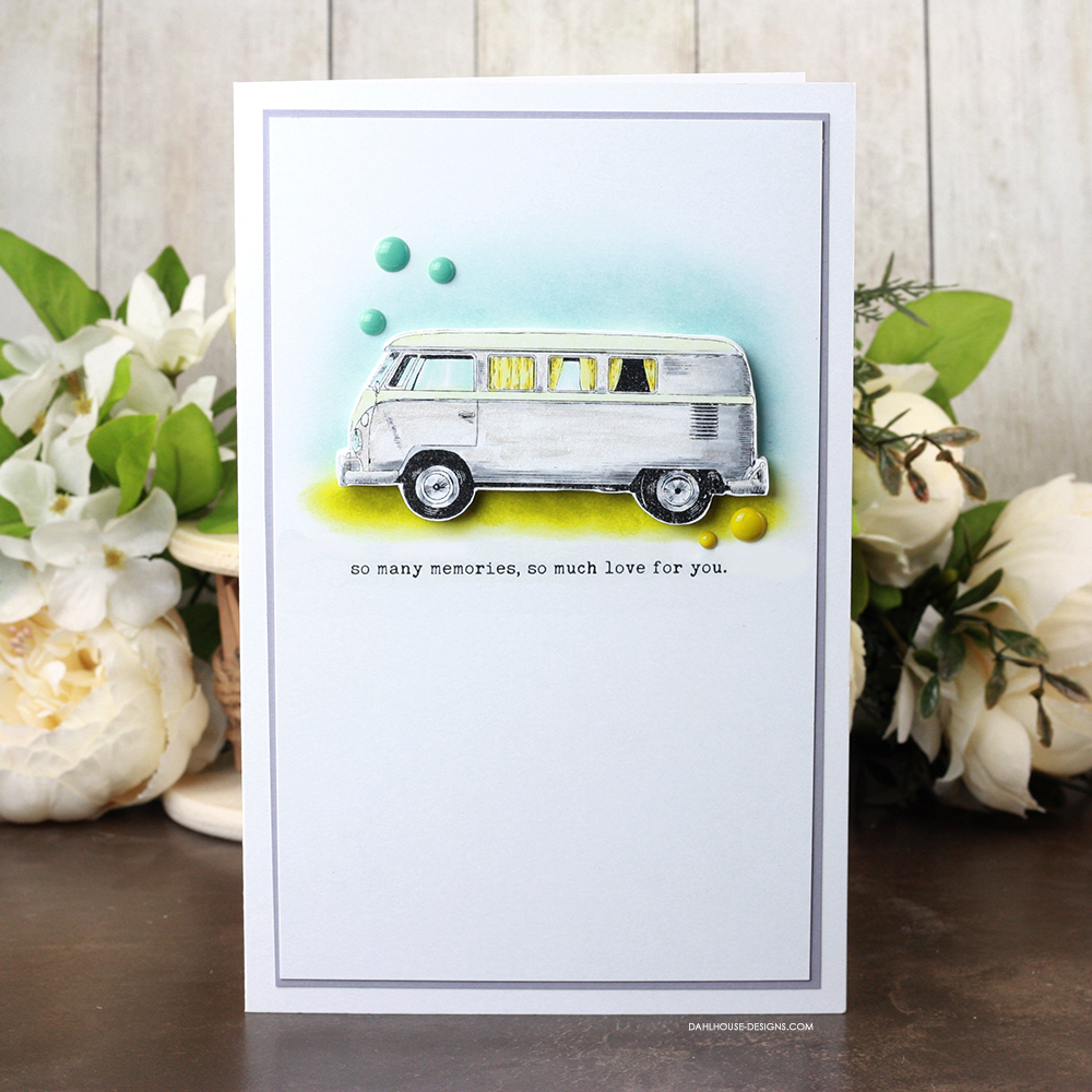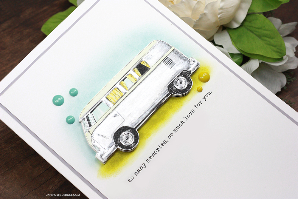For the BIG DIMENSION: I’ve done some simple stamping to layer up the bus images. It only took 3 and some fussy cutting to trim them out. I also stamped the bus on my card base, use some blending brushes to add a bit of a blue sky and grass below with Distress Inks. Then, I glued one bus over the stamped image on the card and popped a second bus up with foam adhesive. The third bus was colored with Copic markers and then to add a bit of shine, I used a metallic watercolor paint all over the body of the bus. It is hard to photograph, but hopefully, the video shows the shine. Then, I just finished it off with a few enamel dots. Just for fun.