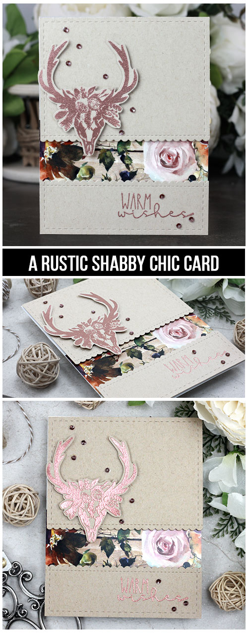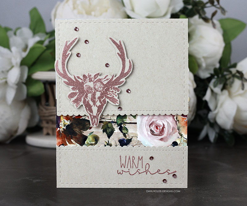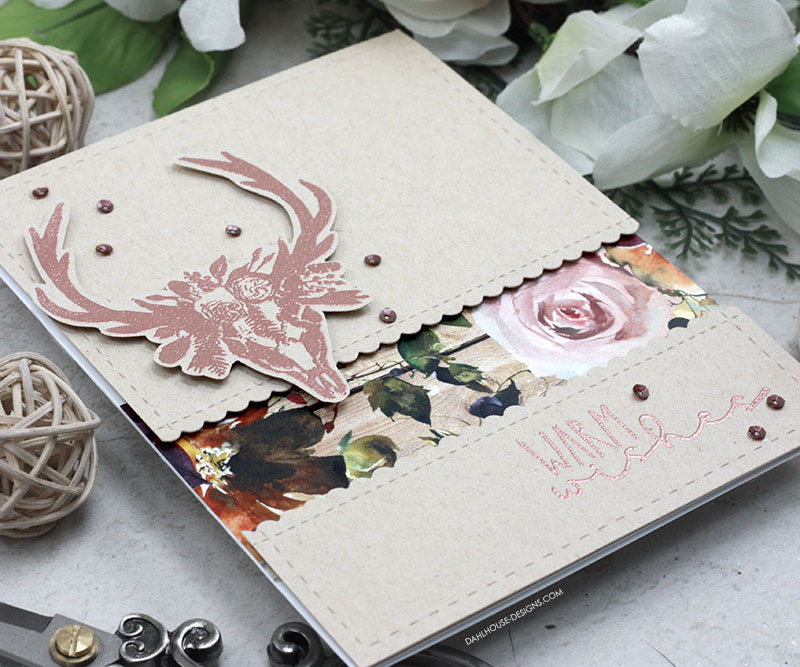 I’m a southwest girl. Born and raised in Arizona, so I love that cowboy rustic style. Especially when it is purty-ed up with beautiful floral papers and a copper shiny accent. I have been wanting something to fit my state’s style. So I designed this rustic skull with some floral accents to soften it up. I love the combo and hope you do too.