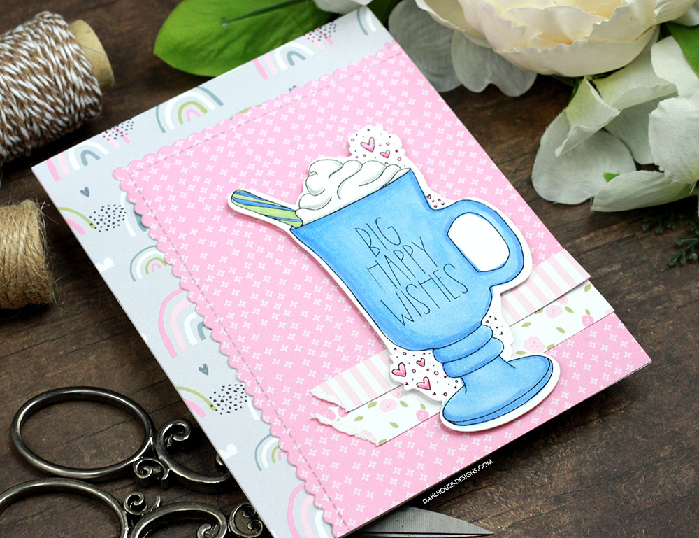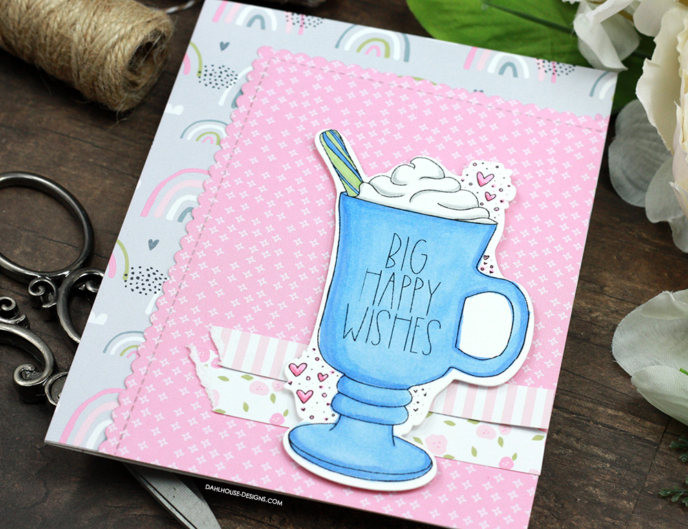 Oh the patterned paper in this card makes my heart go pitter patter. I love them layered upon each other. I used the sketch to create the base of my card and then switched out the heart for this yummy whipped topping mug. It could be cocoa, it could be coffee, it could be anything your heart desires.