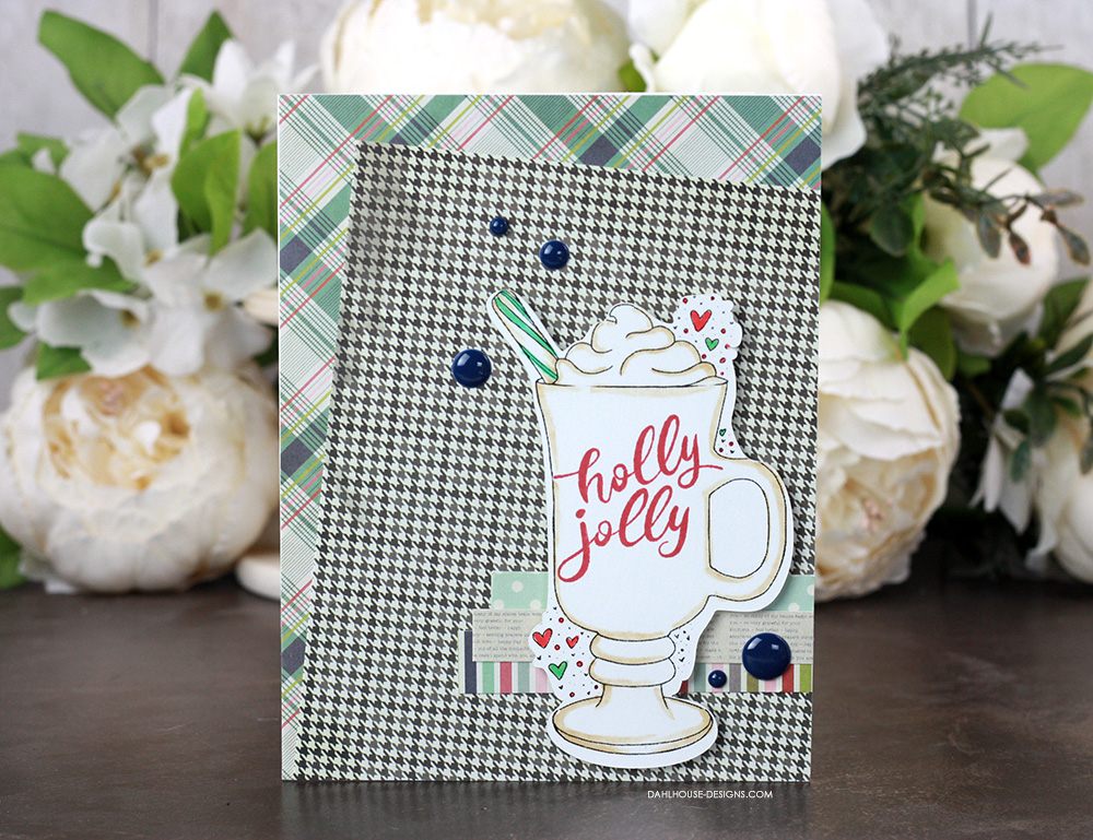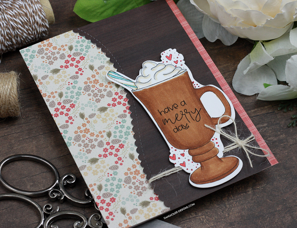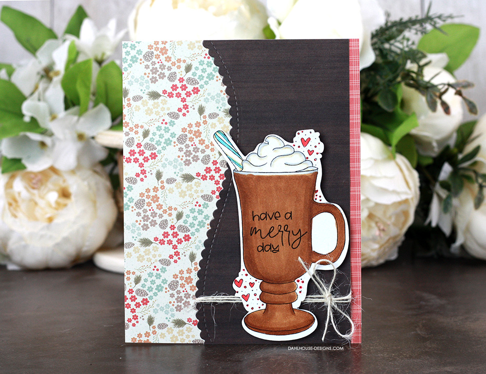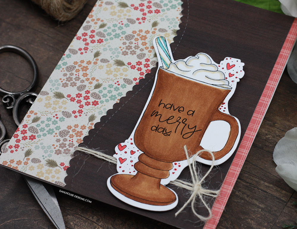I have a completely different layout for this card. I’m loving that scallop curve layered over the different patterned papers. I colored in the mug with Copics to look like coffee or cocoa this time using N1, R83, R85, BG01, E31, E35, E37, and 0.