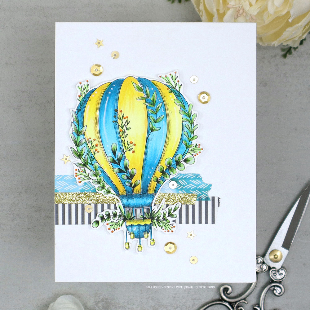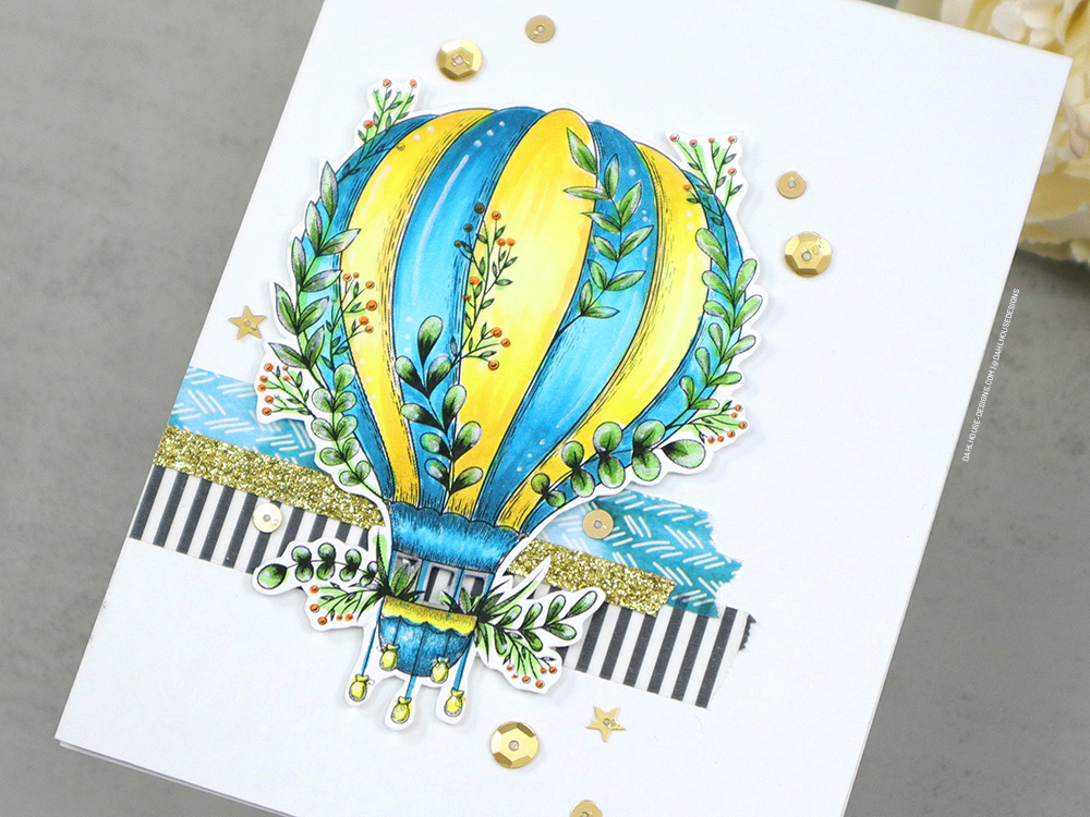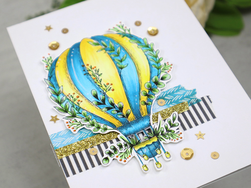 Once I was done coloring, I thought, “Now what do I do with it?” That balloon is so dang pretty that I decided to go with a clean and simple layout. I grabbed my scissors and fussy cut it out. Found some washi tape that coordinated with the balloon colors and laid a few strips down. Popped that balloon up with foam adhesive and added a few gold sequins for some movement and shine.