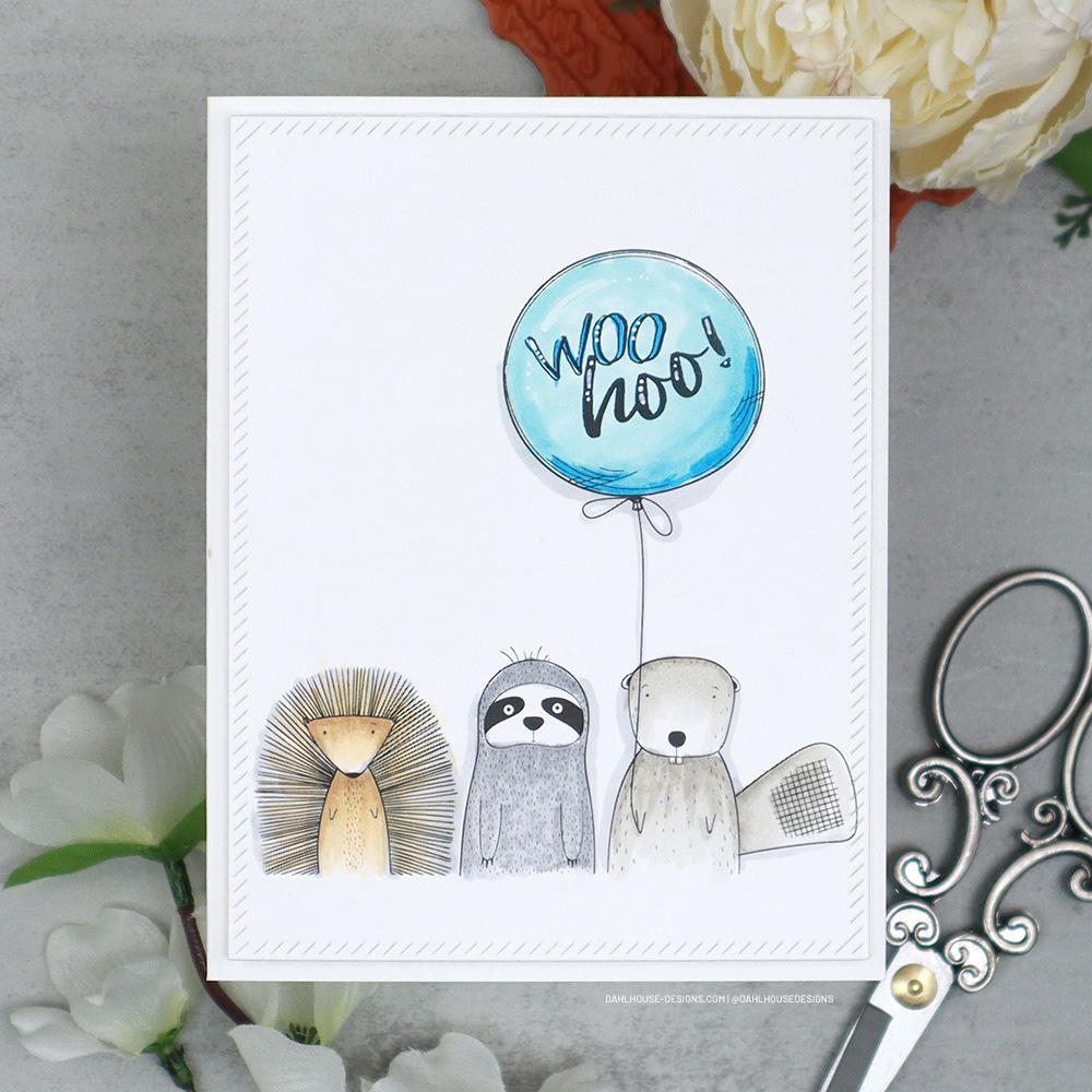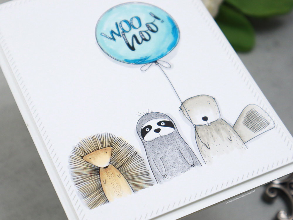 I didn’t even have to mask anything. I used my MISTI and transparency to get the right placement for the balloon and sentiment so the beaver looks like he is holding the balloon. Now we are ready to party! Woo hoo!