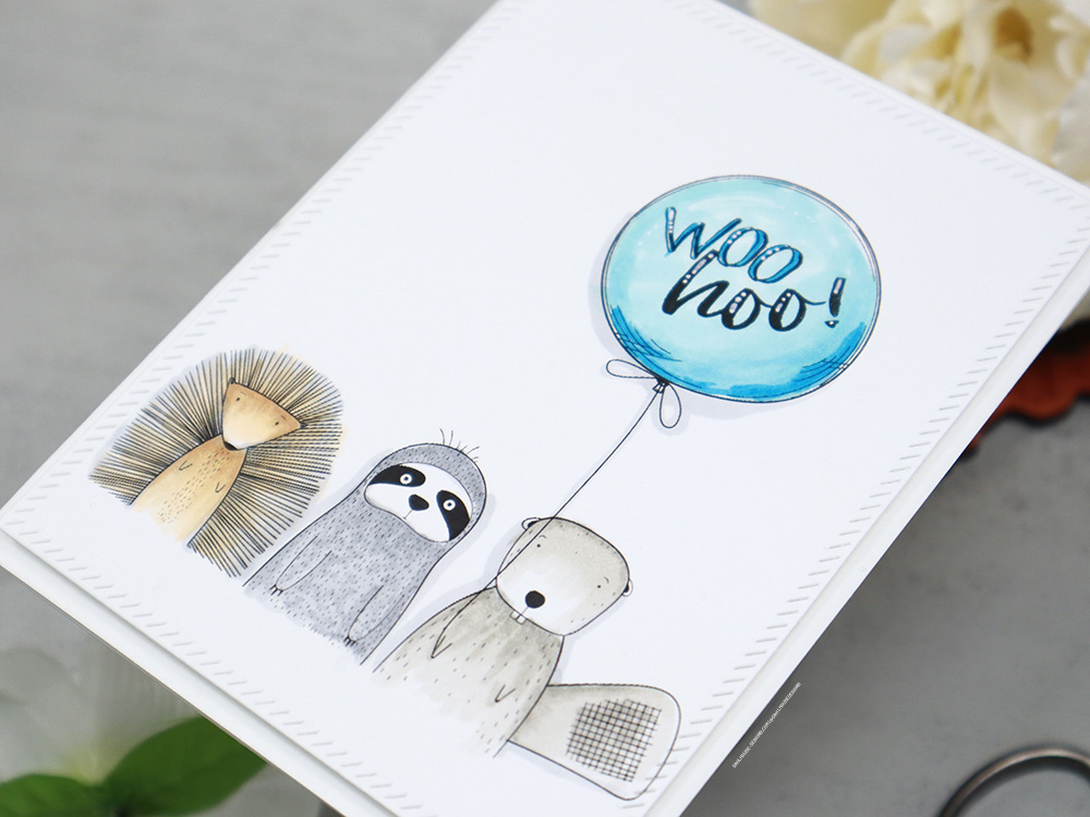 Did this one make you smile? I couldn’t help but smile as I stamped each little critter from Witty Wild Ones. They are too darn cute and fit perfectly side by side on my panel. Once I saw them lined up, I figured they needed to celebrate something and looked for my favorite balloon from Party Mix.