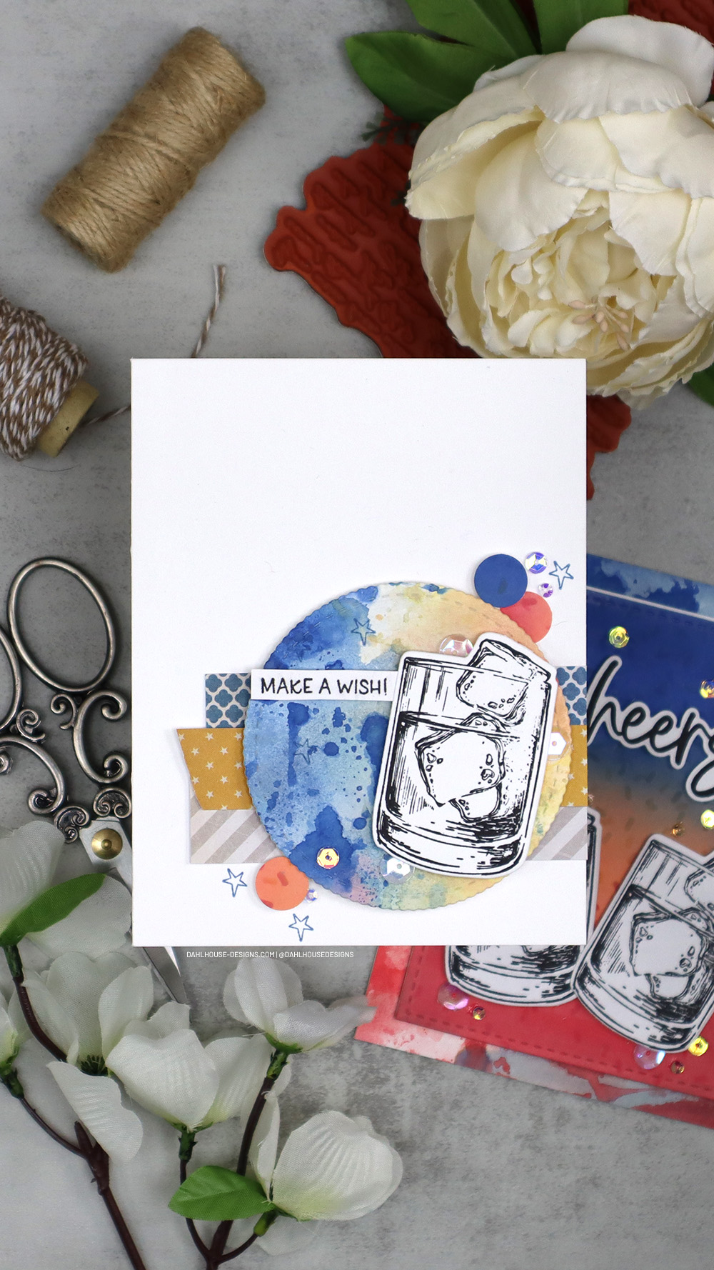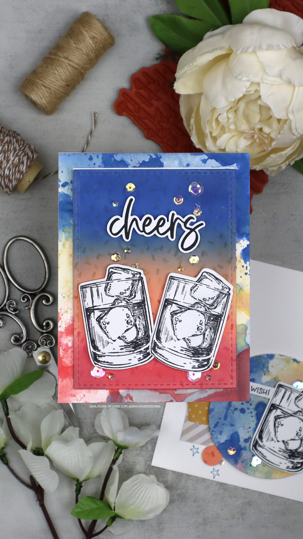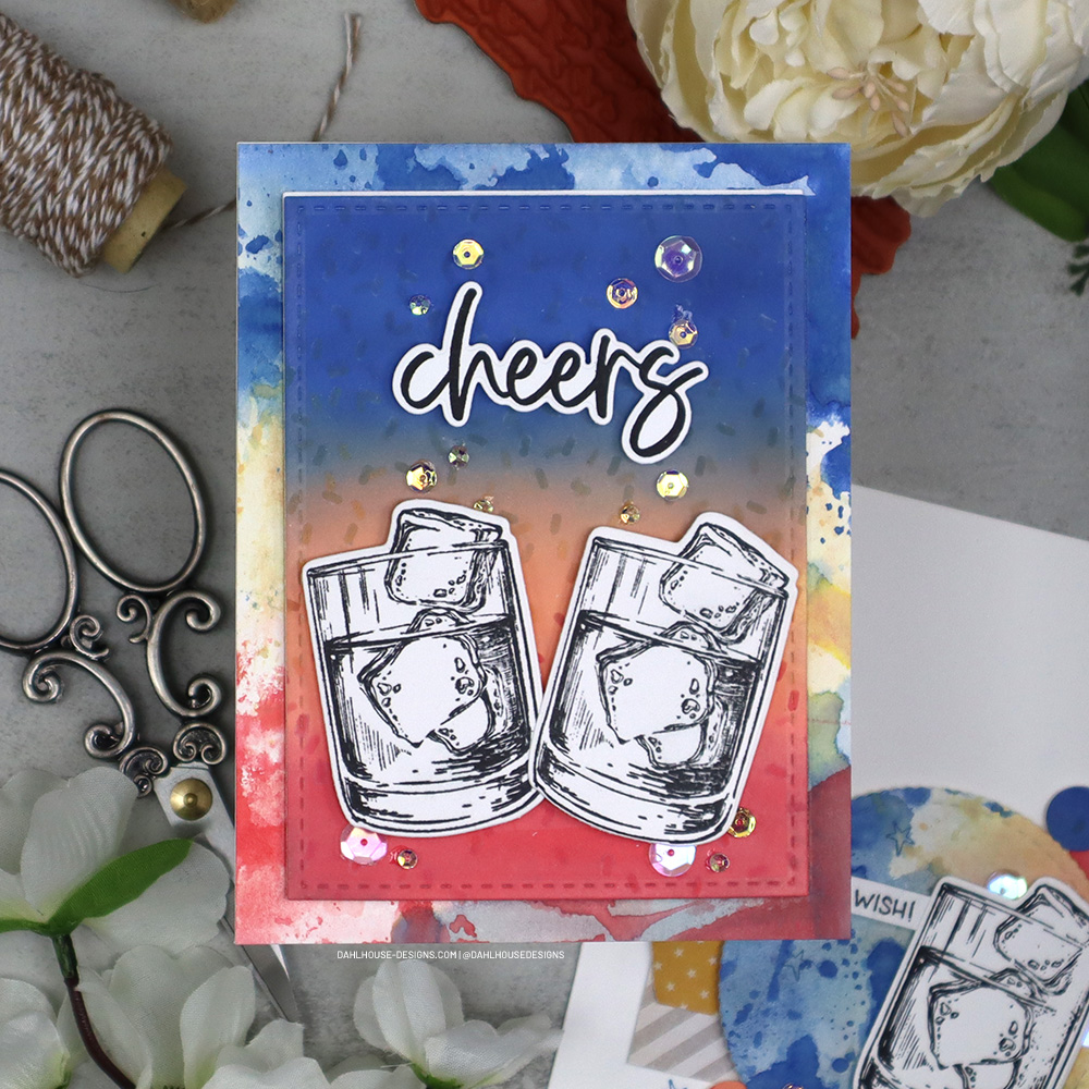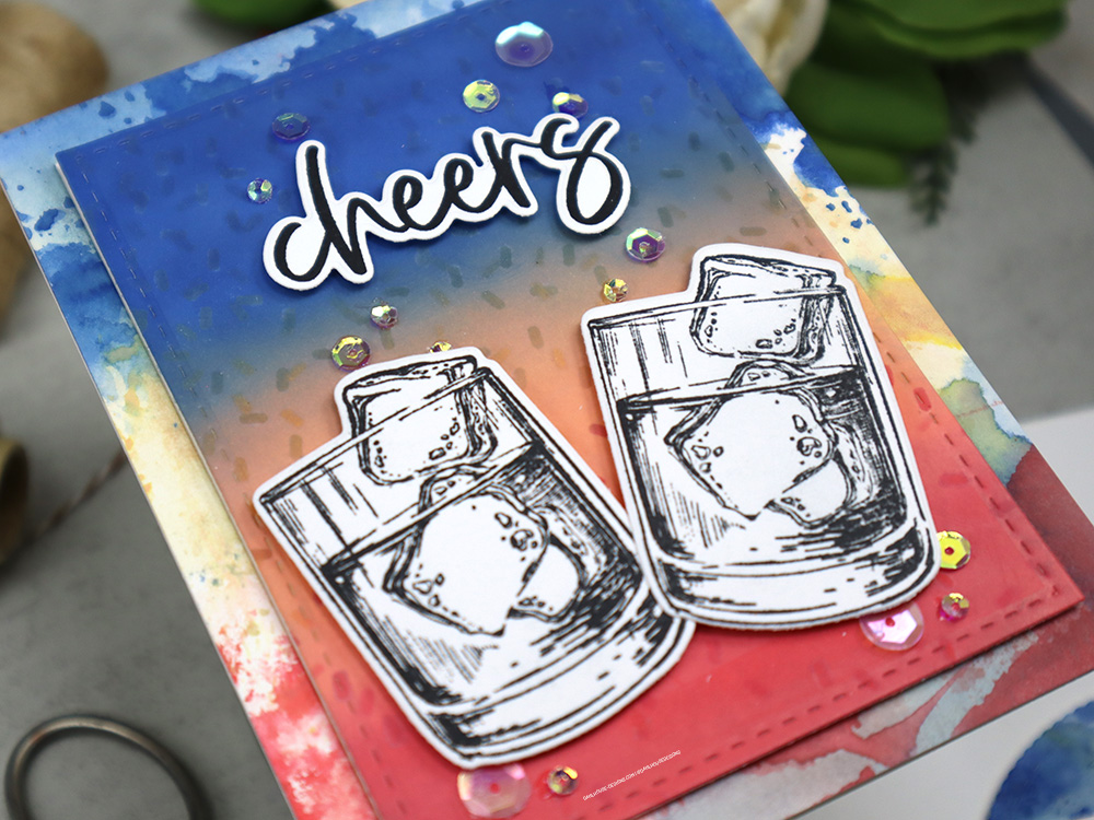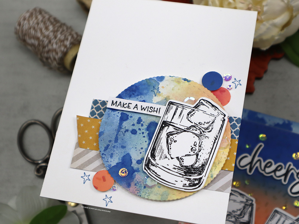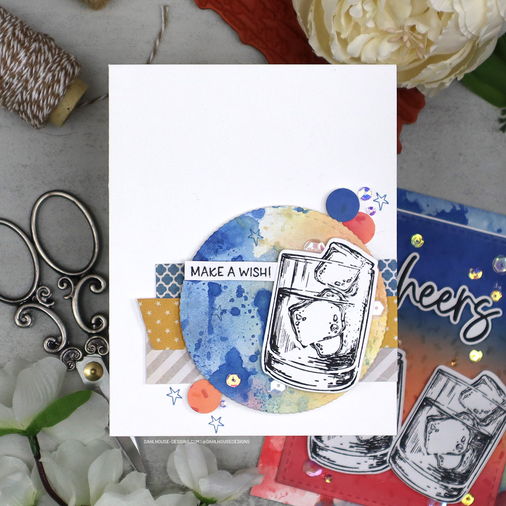 I had some leftovers from the first card and put that ink smooshed background to work for a second card and die cut out a scalloped circle to frame the whiskey tumbler.