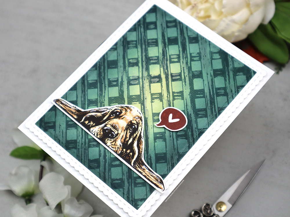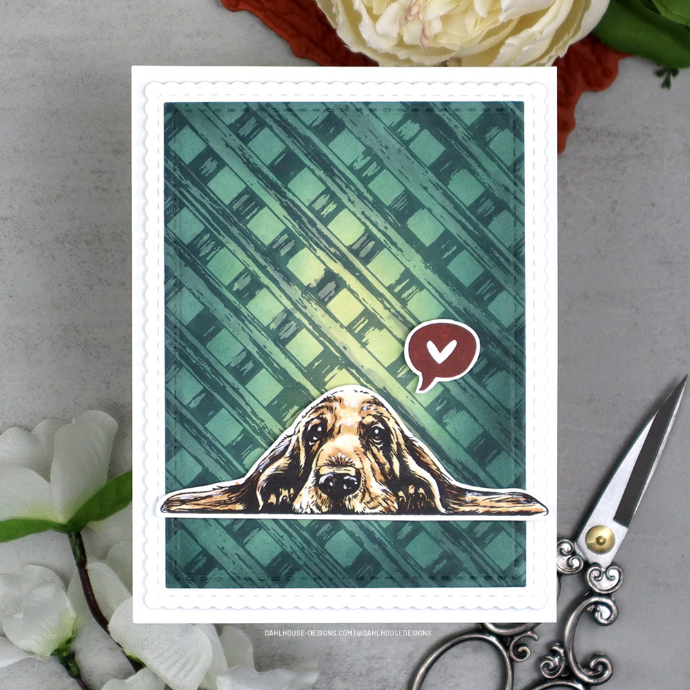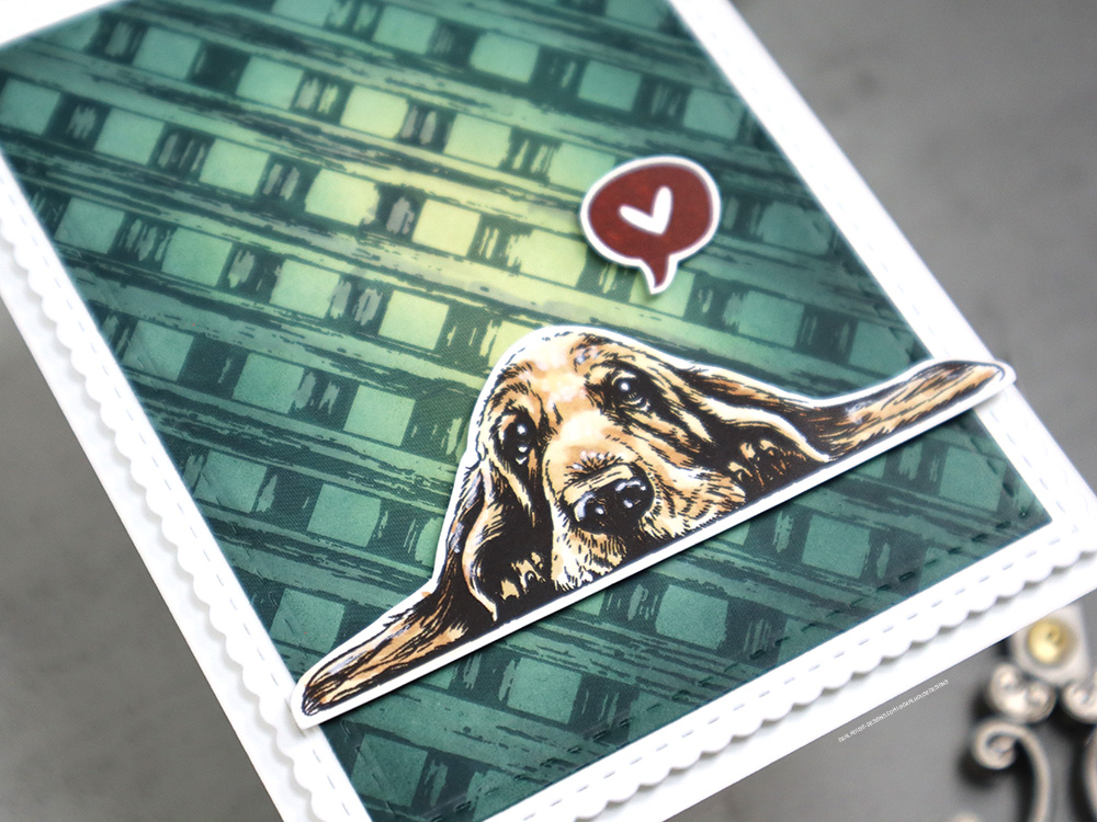 Seriously, don’t you just melt looking into those puppy dog eyes? Basset hounds are just the sweets and funniest little guys. They do stare at you like they love you like no other. I keep the card simple with just a Copic colored pup and thinking of you heart bubble. So perfect to send to let someone know you care.