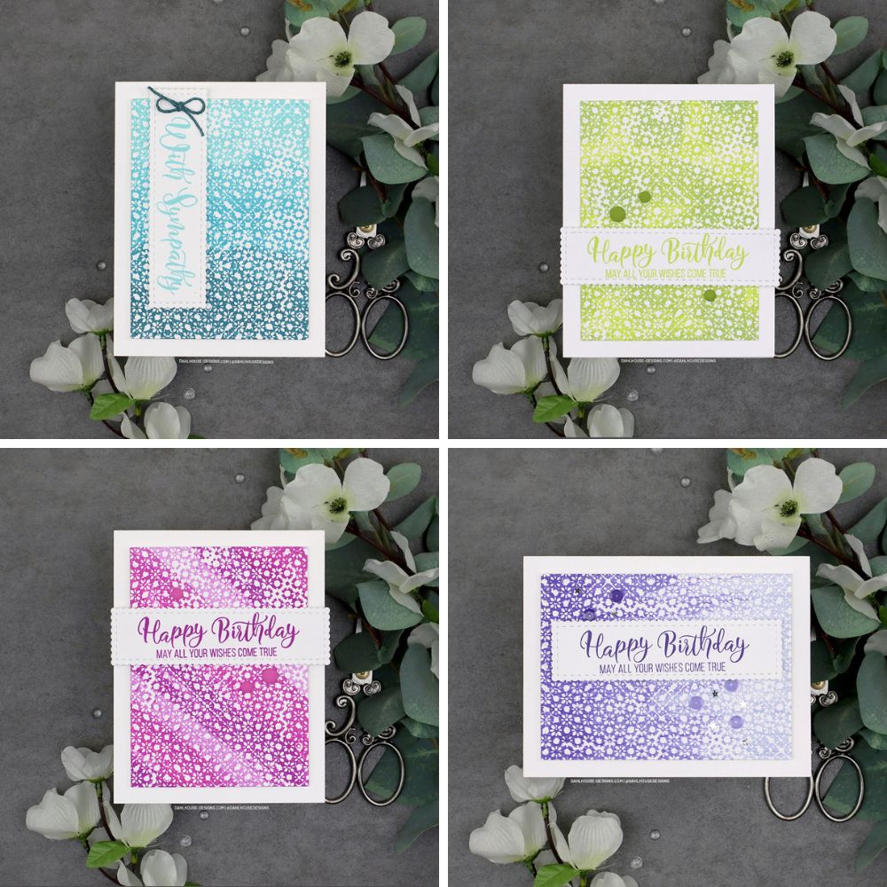 Watch along as I assemble these cards with all my inky tips and tricks using just one background stamp.