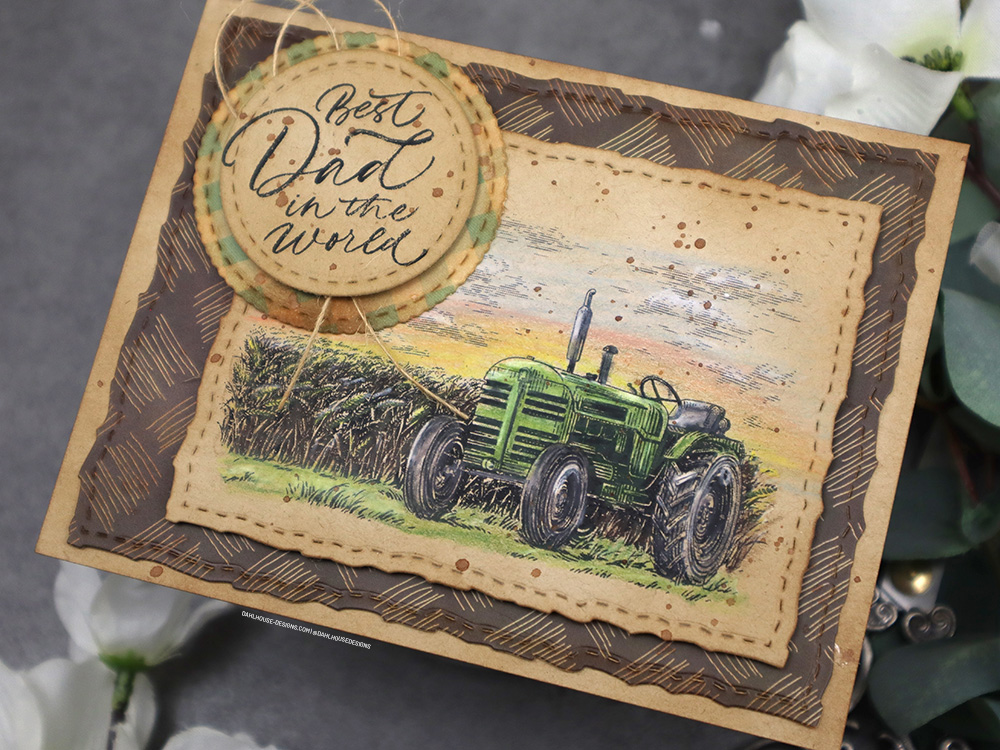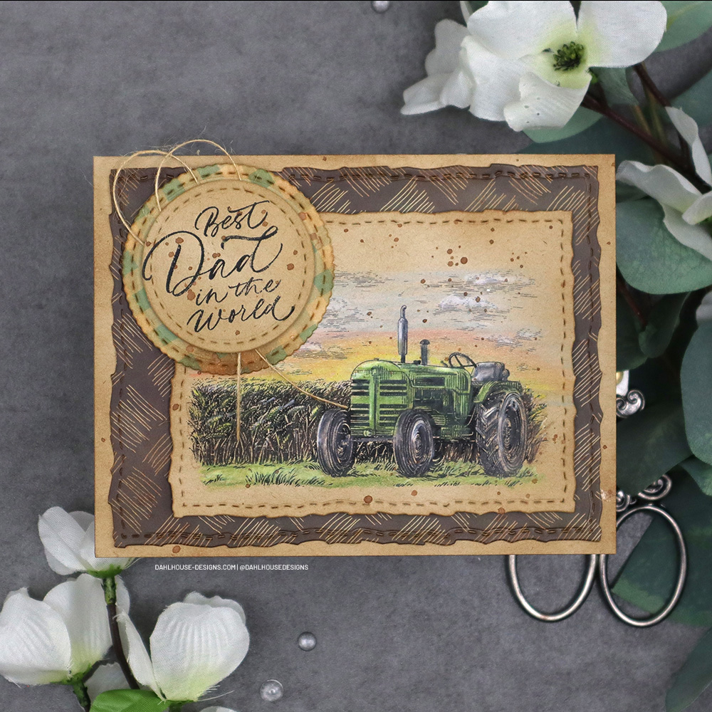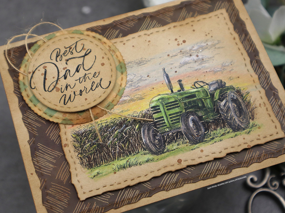 I was so excited to see this tractor in the Kit of the Month. I come from a long line of South Dakota farmers so it was a no brainer to ink this stamp up first. I’m a fan of craft cardstock. I love the warmth it gives to any card, so I stamped that tractor on craft cardstock and pulled out my color pencils to get to work.