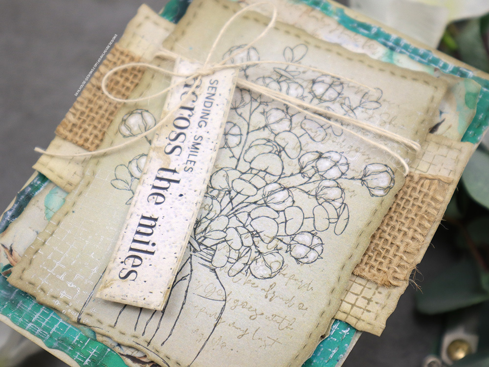 Then I added my stamped images. The beautiful vase of cotton and eucalyptus and sentiment in a dark brown. Then I used my background stamps and only inked up a portion of them to stamp on the layers. It adds a lovely effect to the papers and stamped images. To help those little fluffy cotton tops pop, I added a bit of white pen accents.