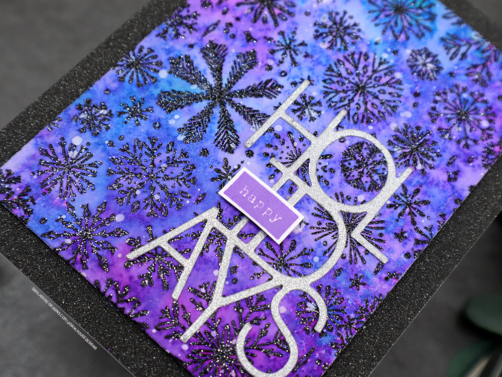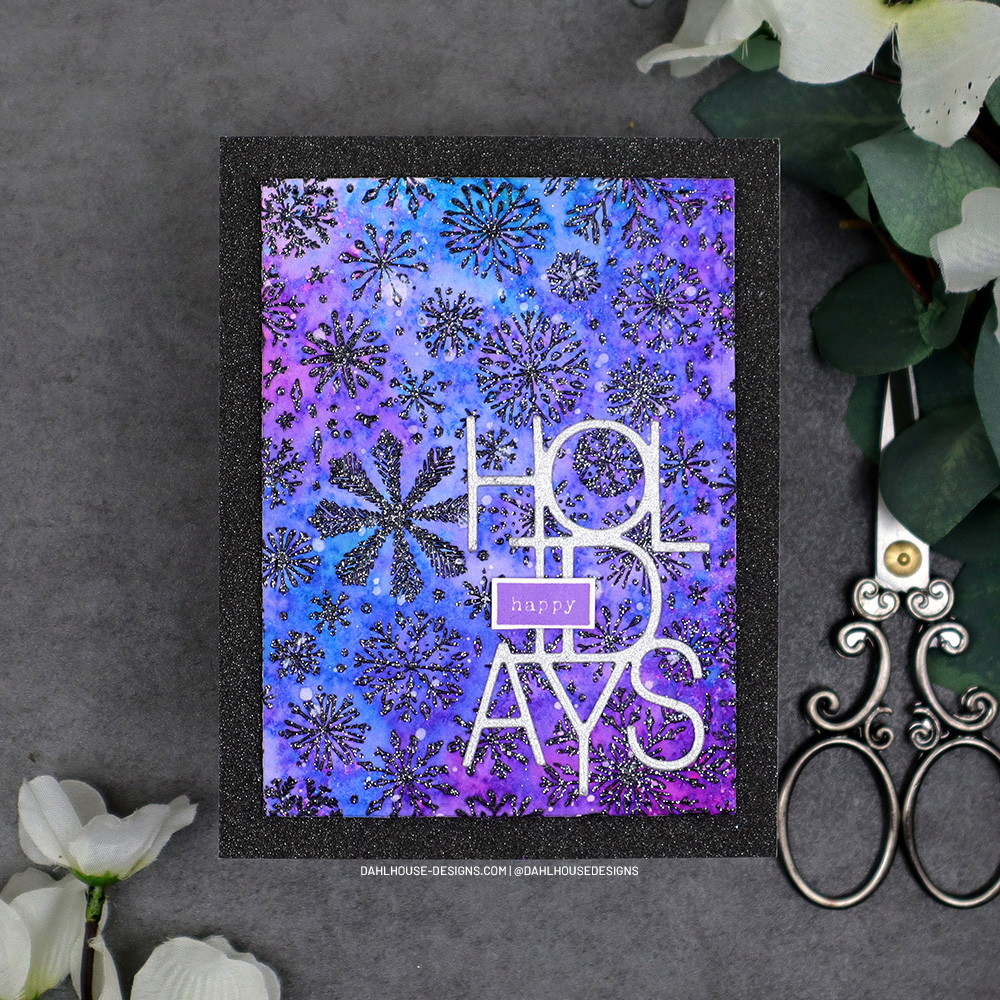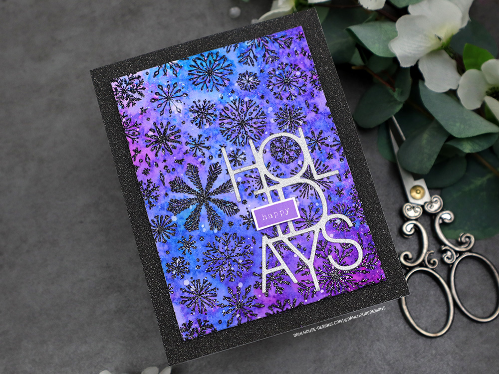 I’m using glitter – but not the messy kind. I usually avoid glitter at all costs, but in today’s card, there is no mess. The embossing powder has sparkly silver mixed in with it and then I love the shine from the glitter paper for the background and “holidays” die. All the pretty glitz and no messy fallout. It’s a win-win.
