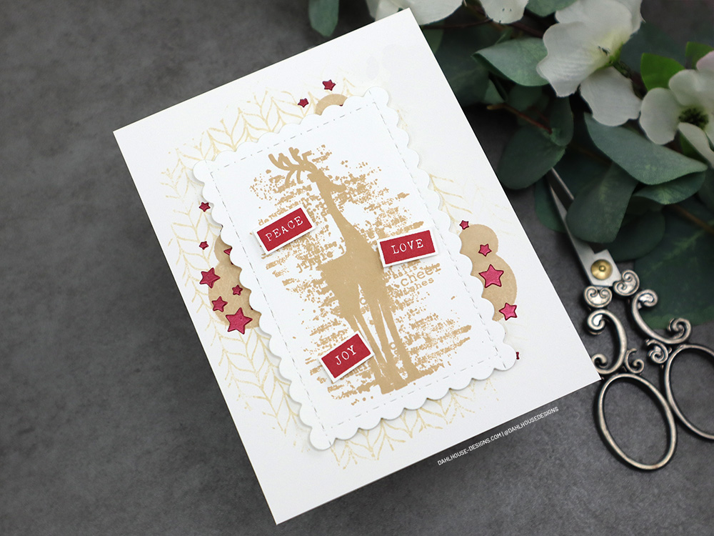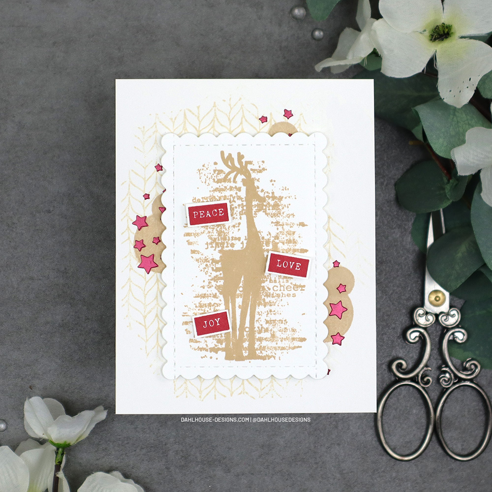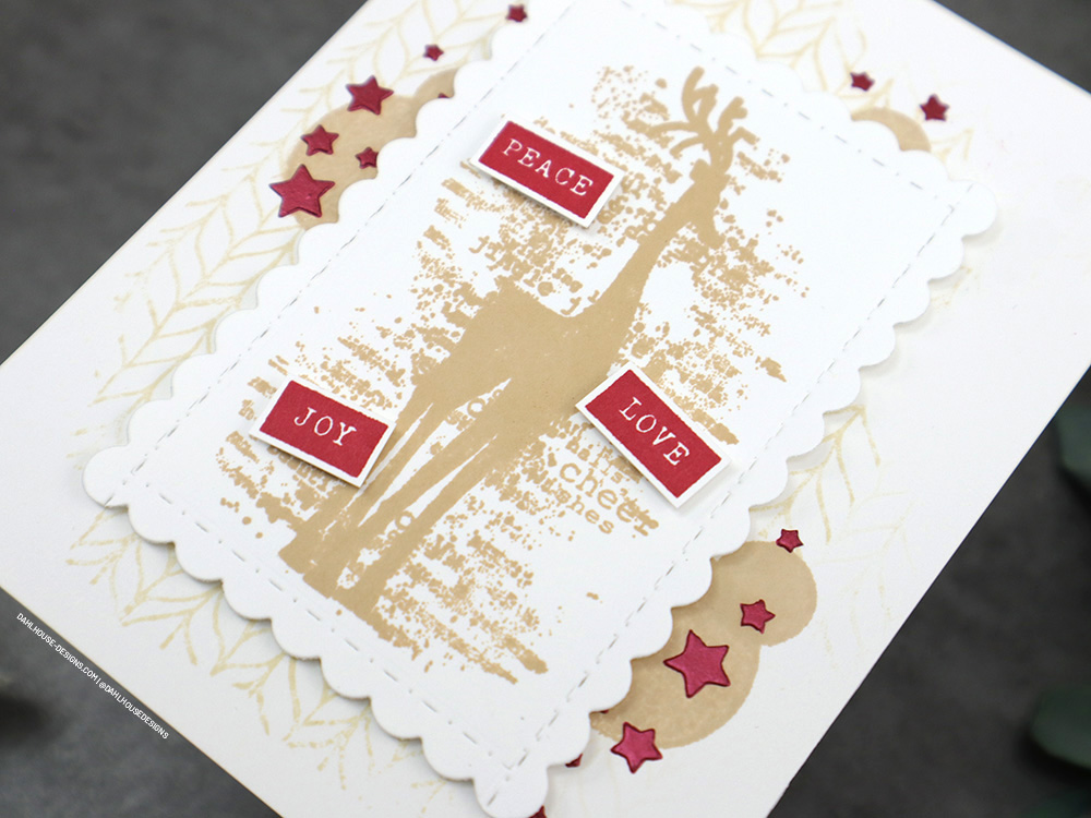 I started by stamping the background sweater pattern in kraft and added a few circles so they would peek out behind the deer panel. Once all that was in place, I used a star stencil to apply the Game Over Lunar Paste just over the stamped circles. It is hard to capture the shine, but when you move the card those stars really twinkle.