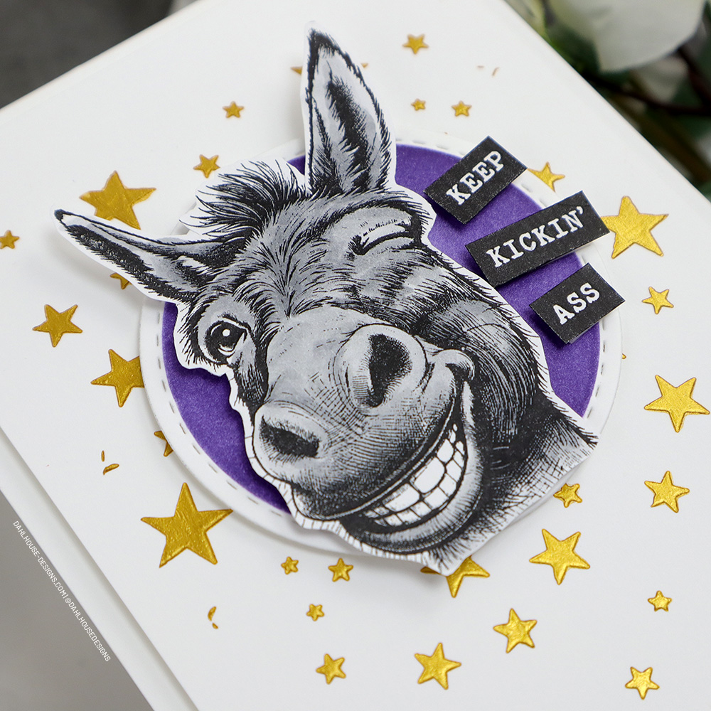 I kept things simple with some stars and a bold circle die cut to feature the Copic colored donkey.