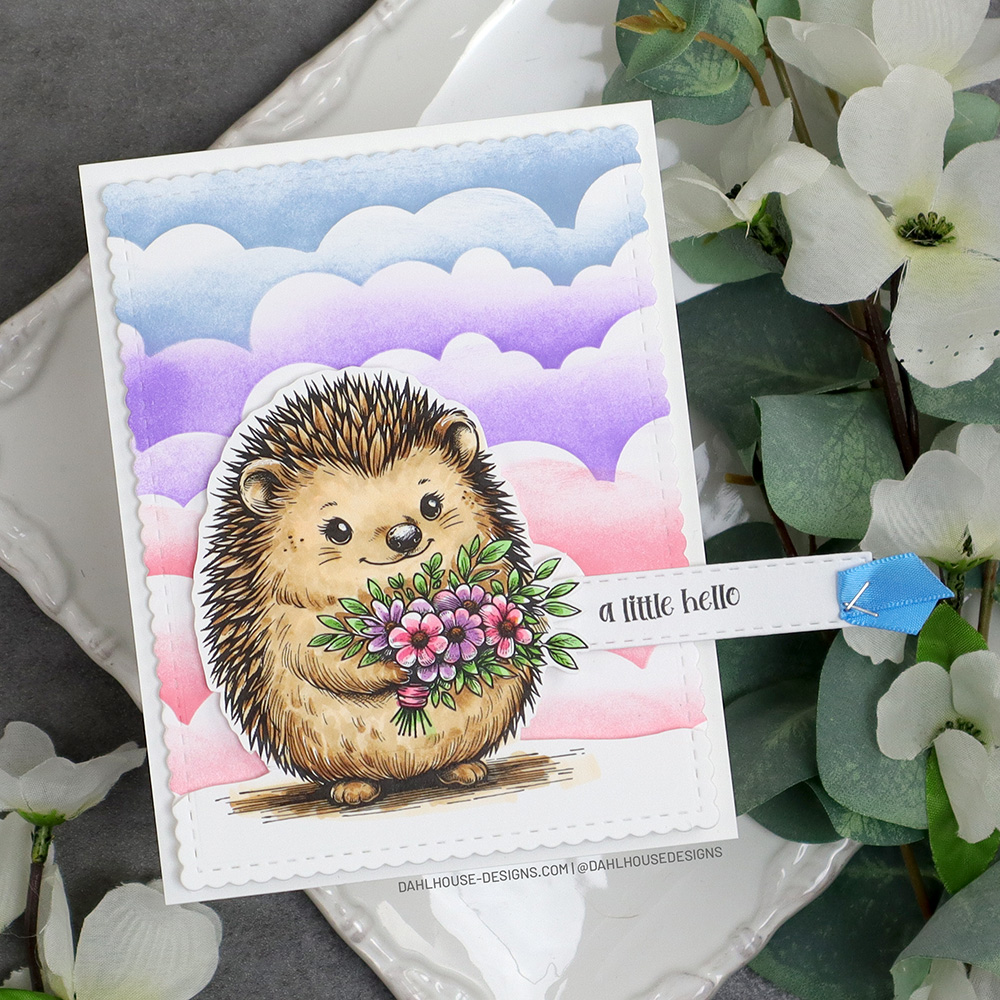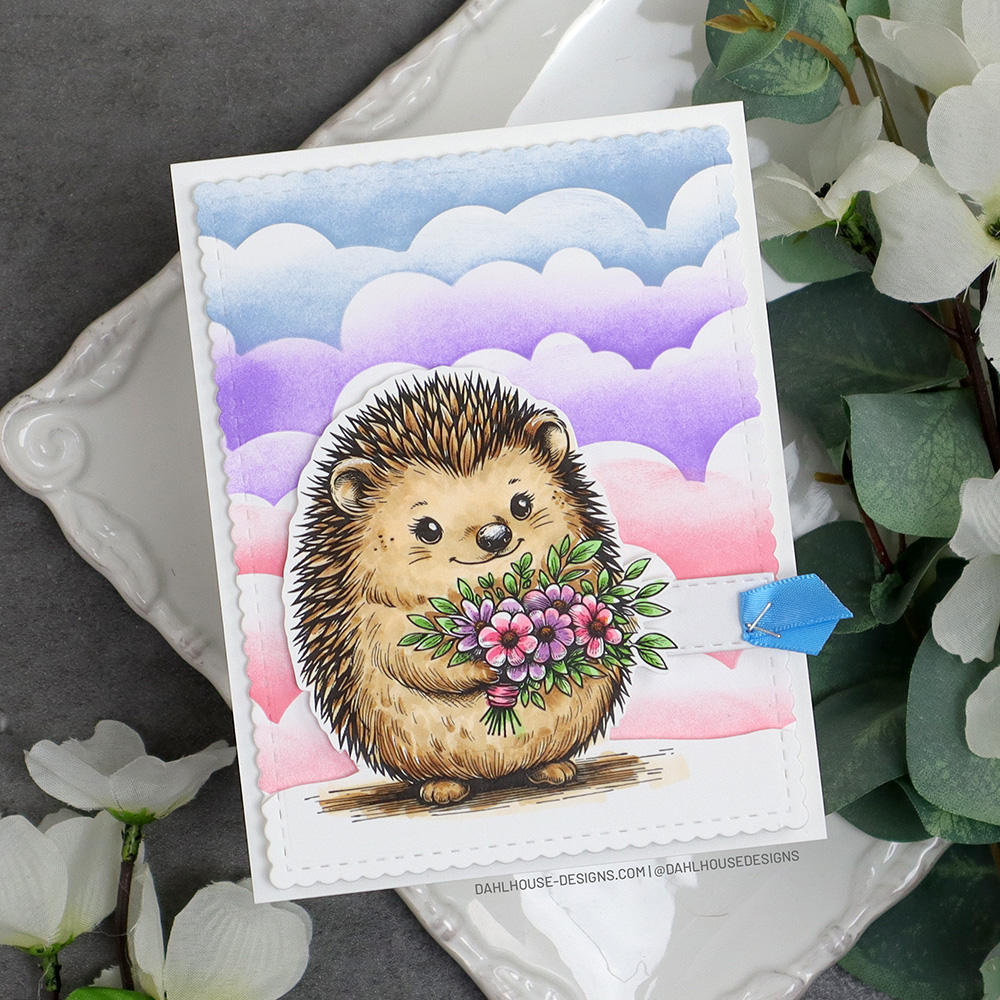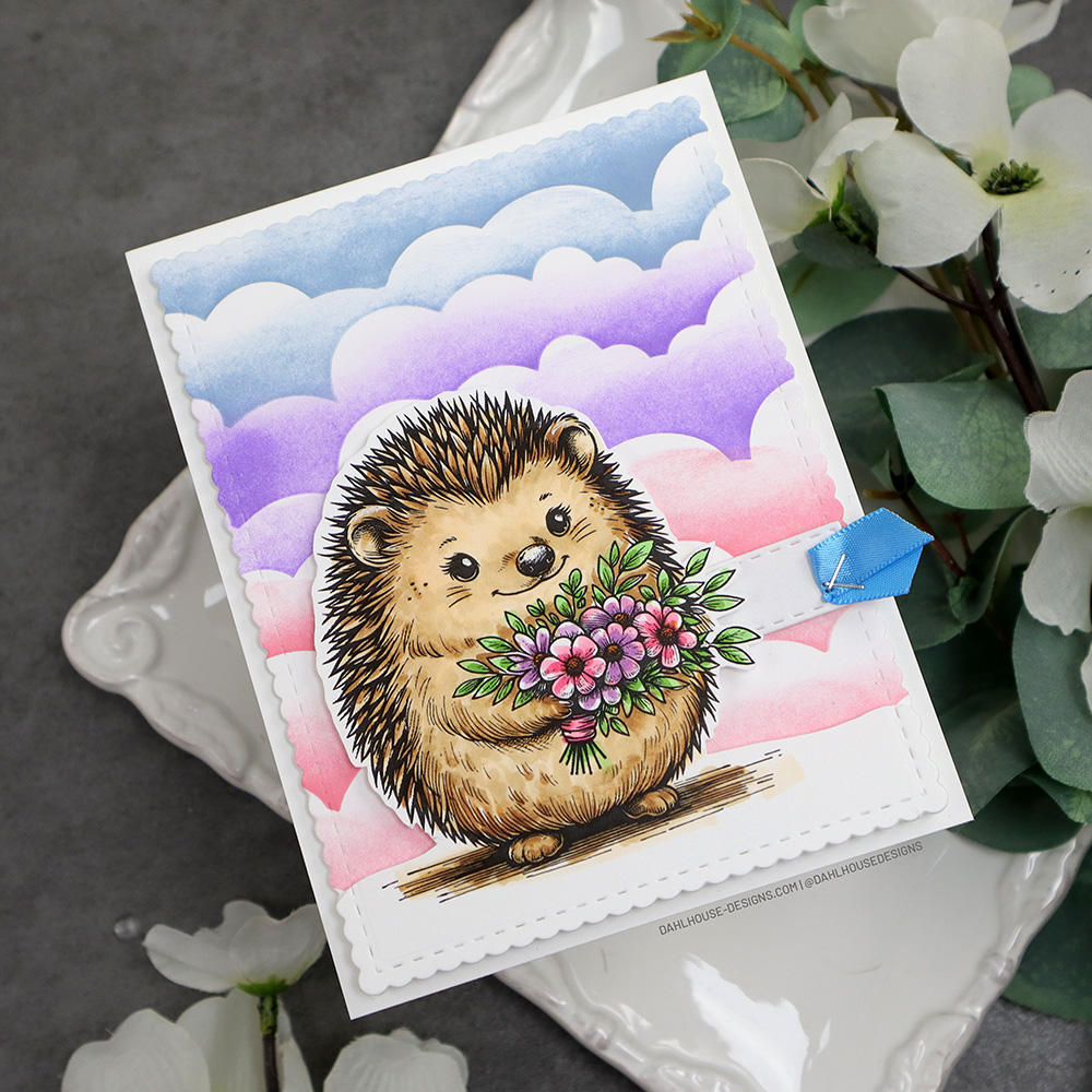 The hedgehog was stamped on white cardstock and colored with Copic markers: E51, E31, E35, E37; YG13, YG1; V12, V15; RV23, RV29; Y14.