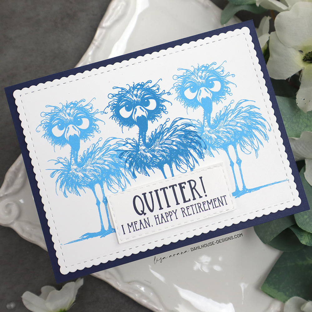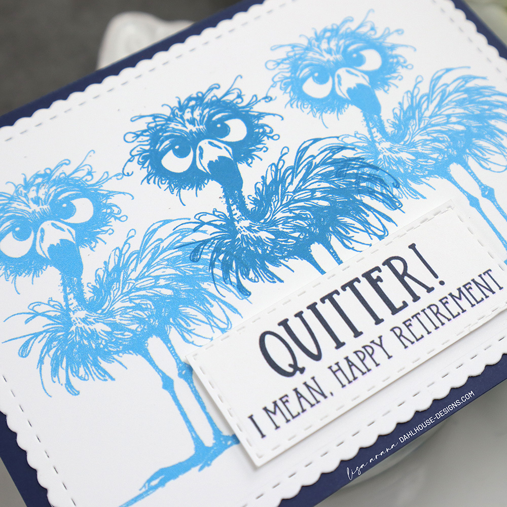 I stamped that funny flamingo three times to create an ombré effect that stands out against the crisp white scalloped panel. The bold sentiment adds a playful punch of humor. What I love about this card is how fast it is to make, while still packing a ton of personality!