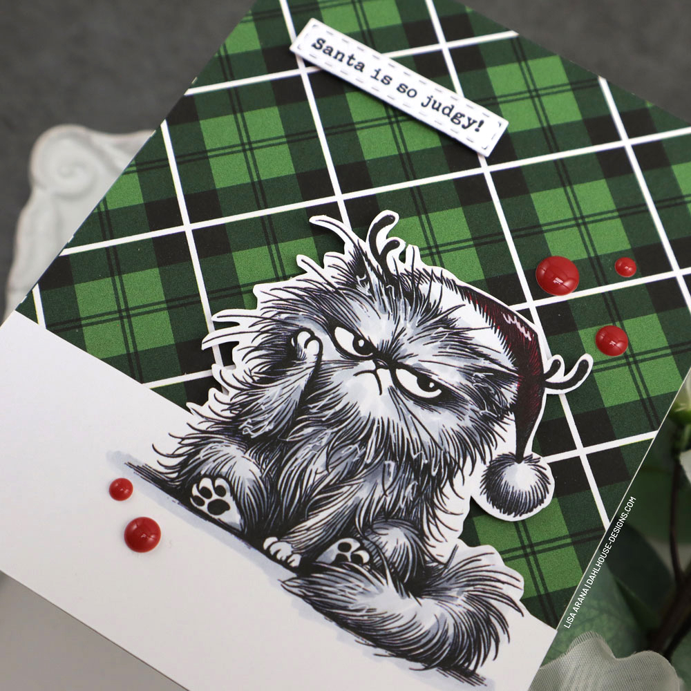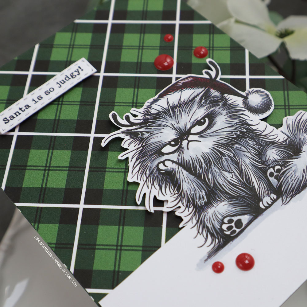 The green plaid pattern is not just a backdrop but a bold statement that contrasts beautifully with the black and white image. It adds a cozy yet vibrant holiday feel that perfectly offsets the kitty’s grumpiness. When choosing your background, go for a design that complements your main image without overwhelming it. This plaid is the perfect blend of festive and funky, making the entire card pop! - Finishing Touches: