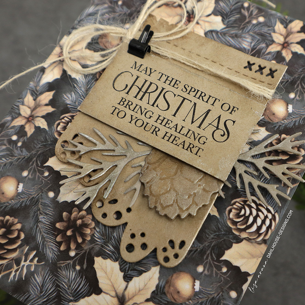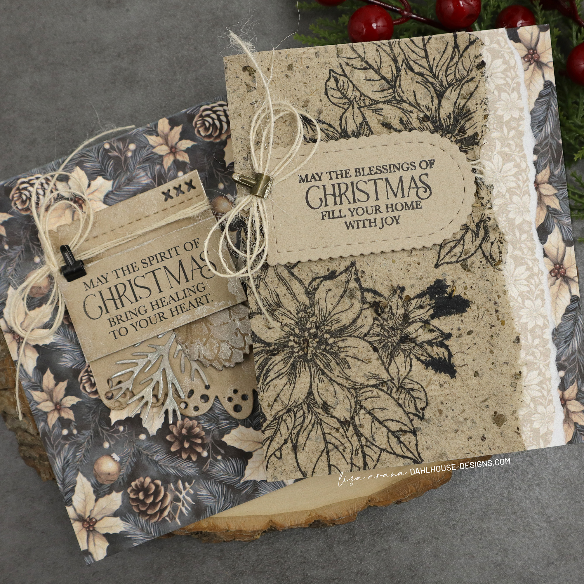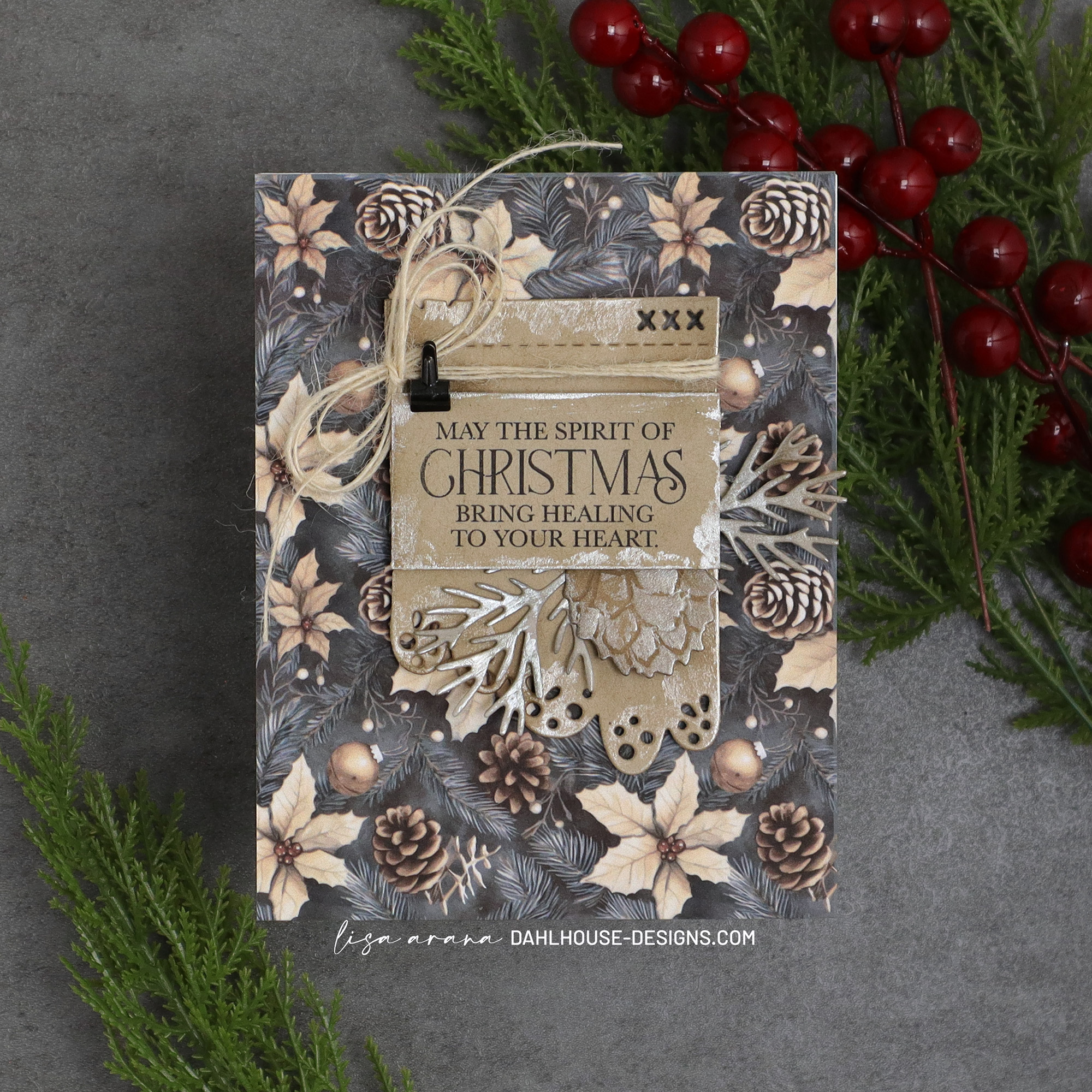 This first card is all about showcasing the pretty poinsettia patterned paper in a way that feels cozy yet elegant. The focal point is a die cut tag that holds the sentiment, surrounded by small die cut elements for added texture. A bit of metallic paste brings a soft, uplifting shine, making this card an especially thoughtful choice for anyone facing challenges this holiday season.