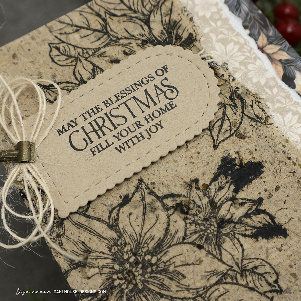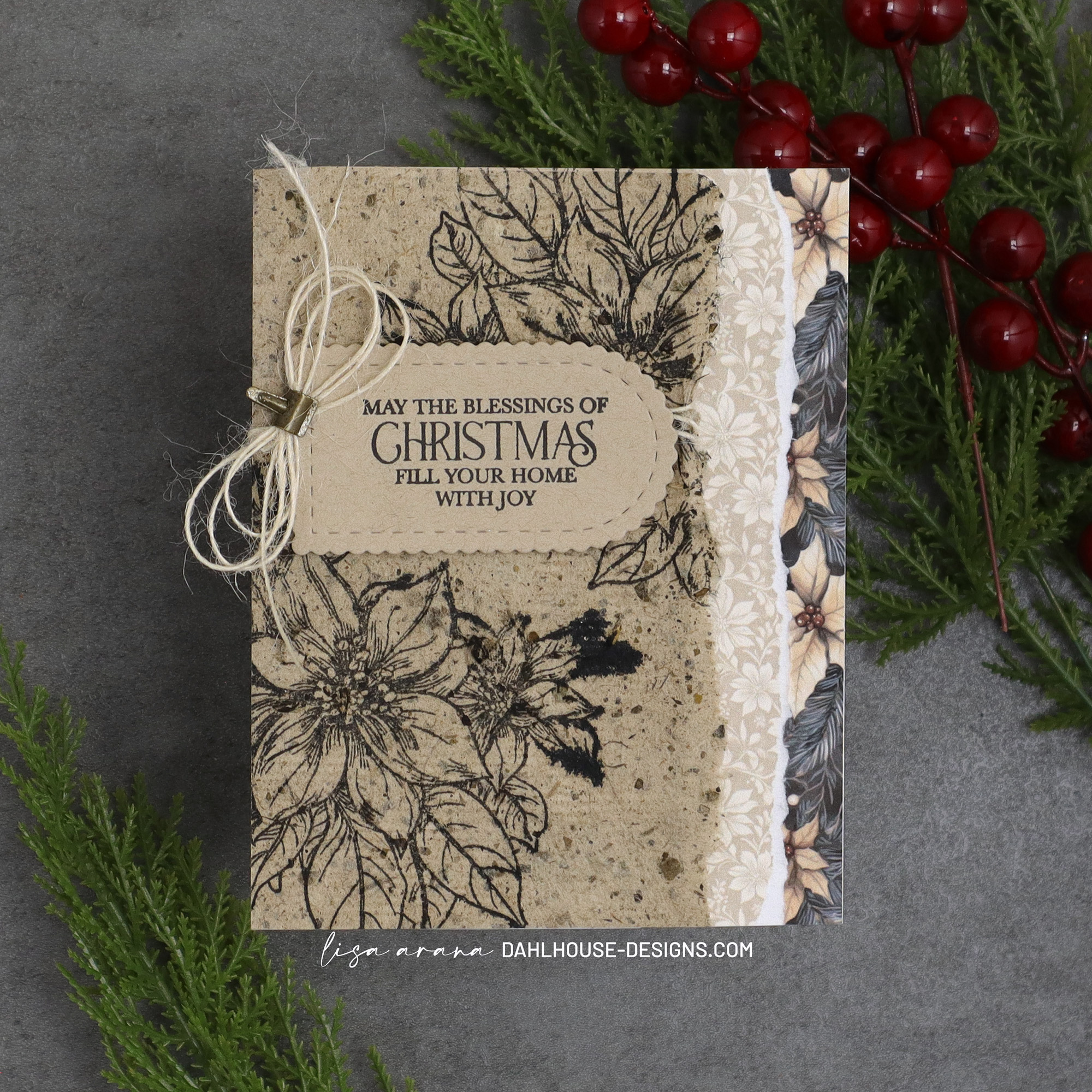 This first card uses a simple layered layout that highlights the soft torn edge of mulberry paper for a rustic, handmade touch. The simple stamping of poinsettias on the mulberry paper adds beautiful texture that coordinates perfectly with the patterned paper edge. I love how this layout uses up patterned paper scraps, creating an elegant look without fuss.