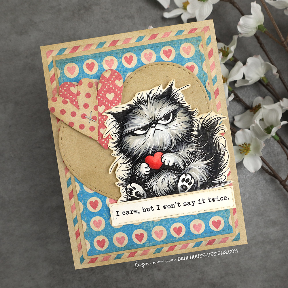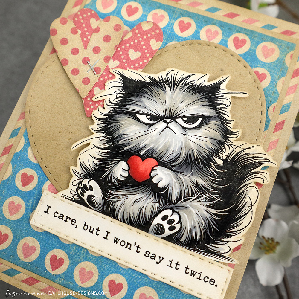 This Valentine’s card is the perfect way to let someone know you care, without getting too mushy. It features this aloof-looking kitty, colored with Copics to bring out its bold personality. Layers of heart filled pattern paper in shades of red, kraft, and teal create the perfect backdrop. A stitched die-cut heart adds extra charm, while the cheeky sentiment ties it all together with a bit of snarky humor.