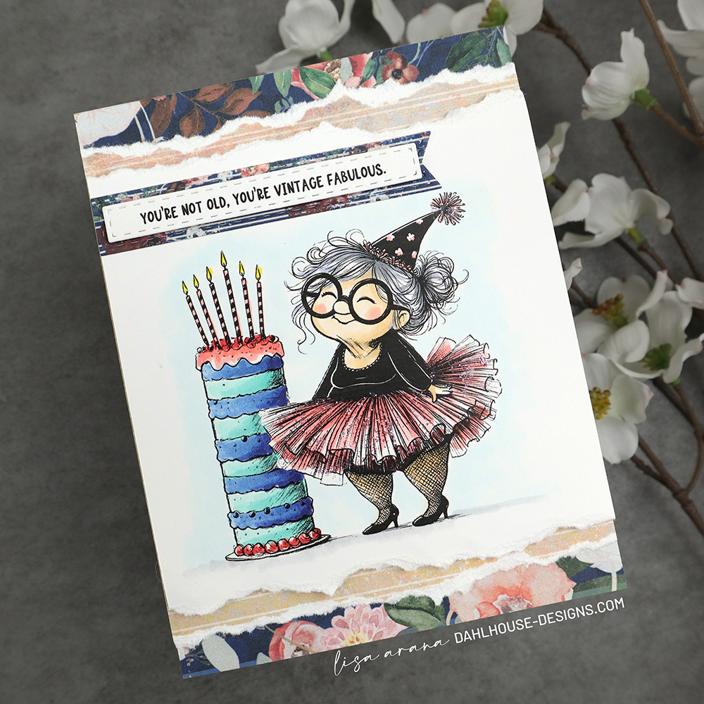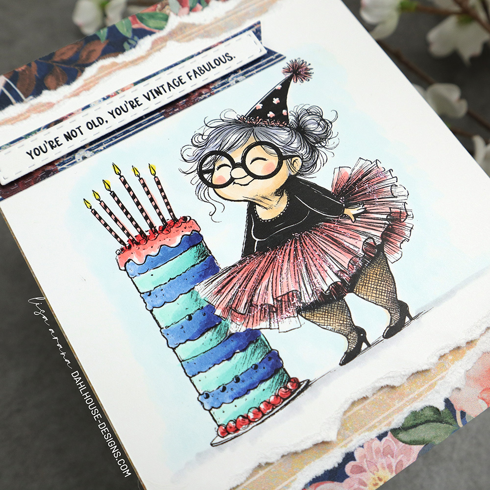 This playful birthday card features this darling granny wearing a glittery tutu and a cheeky smile. She was colored using Copic markers to match the pattern paper. The torn paper layers of floral and neutral patterns frame the design beautifully, creating a soft yet bold backdrop. The sentiment and banner strip, perfectly captures the mood: “You’re not old, you’re vintage fabulous.” A touch of glitter glue to the tutu and hat adds serious glam and sparkle. It’s a delightful mix of elegance and fun, perfect for any birthday celebration.
