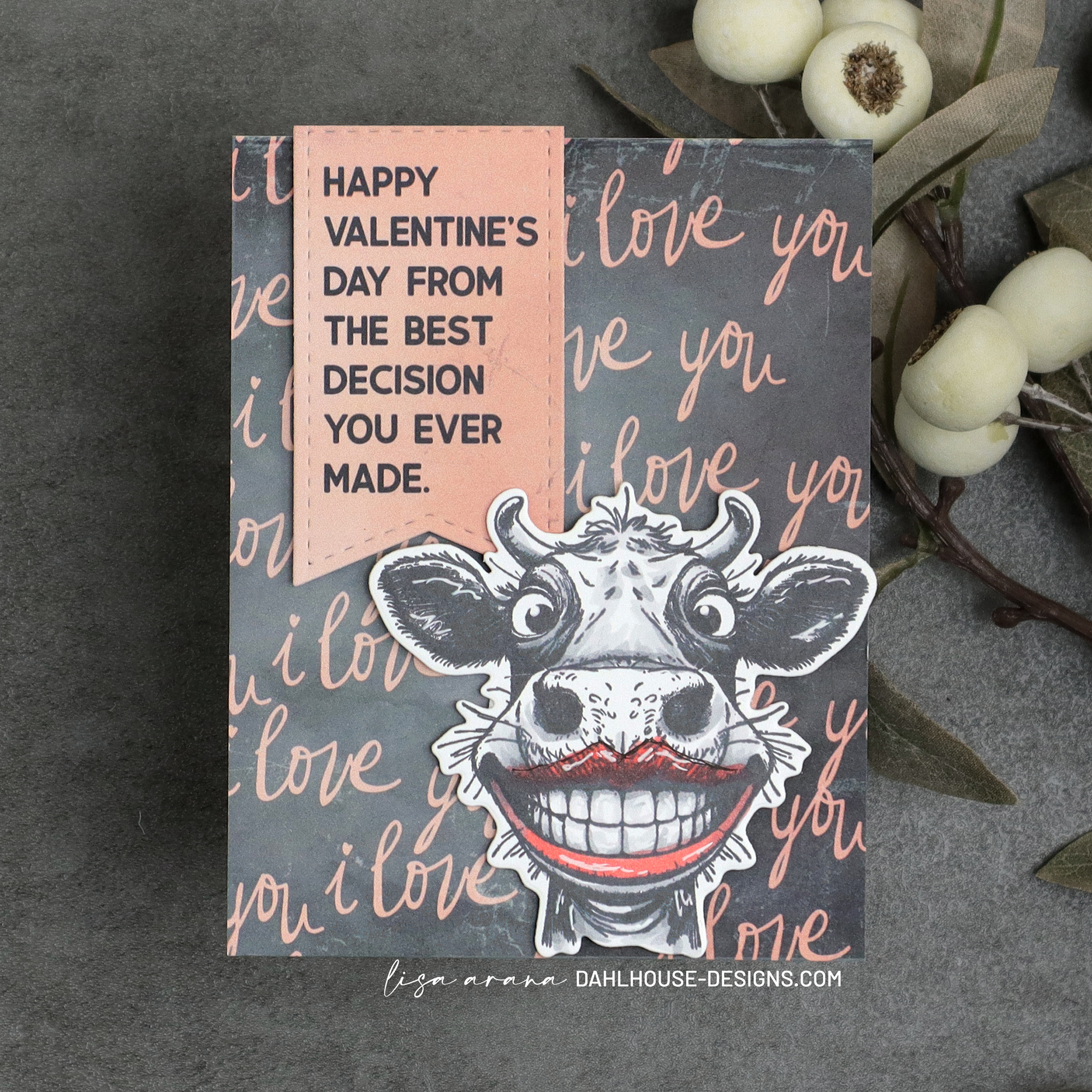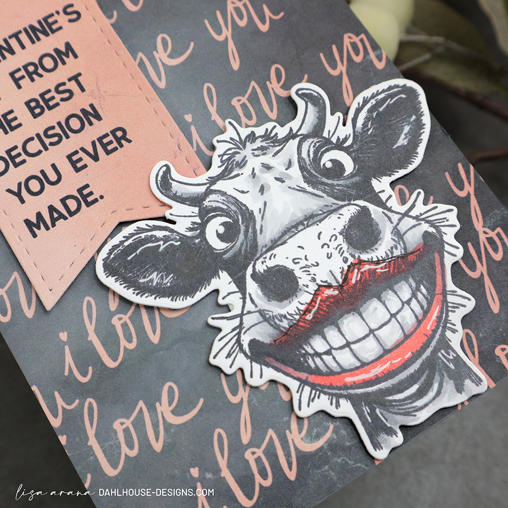 Who says Valentine’s Day has to be all hearts and flowers? Sometimes, a little humor is the best way to show love! Especially for guys. This card features a smooching cow to match the cheeky sentiment from a new stamp set by Unity Stamp Company. Something I think any guy would love for Valentine’s Day. I have a fun JAM SESH video for this snarky creation so you can see all that lip smackin’ fun in action.