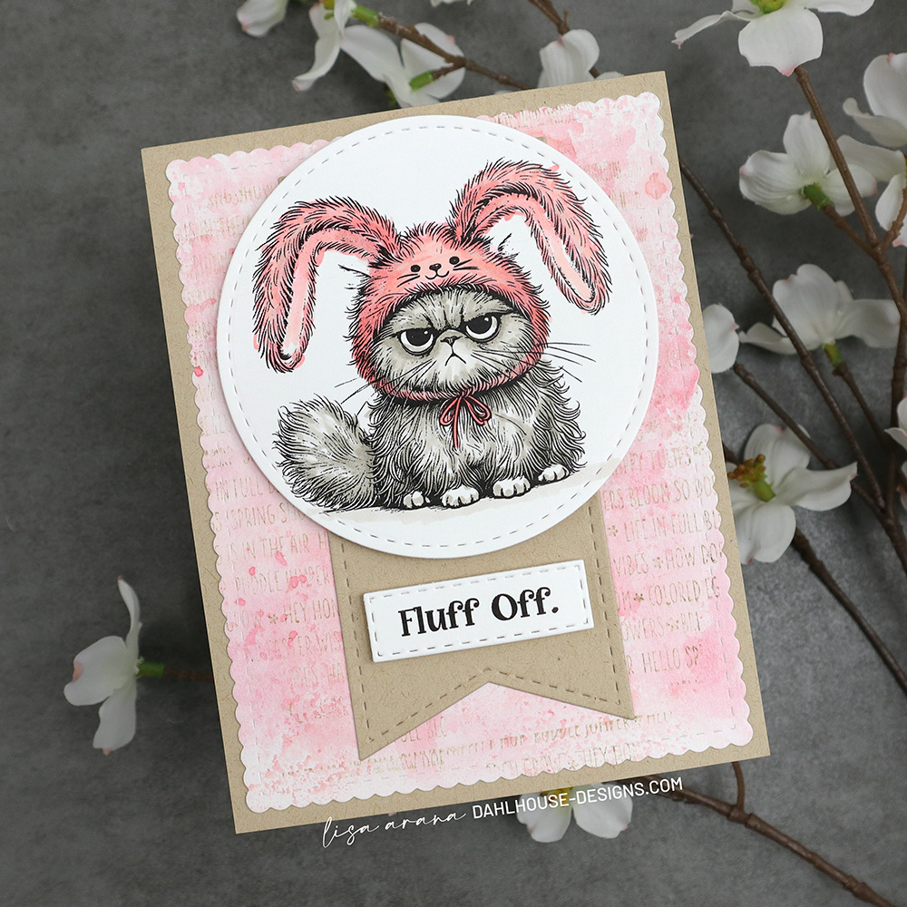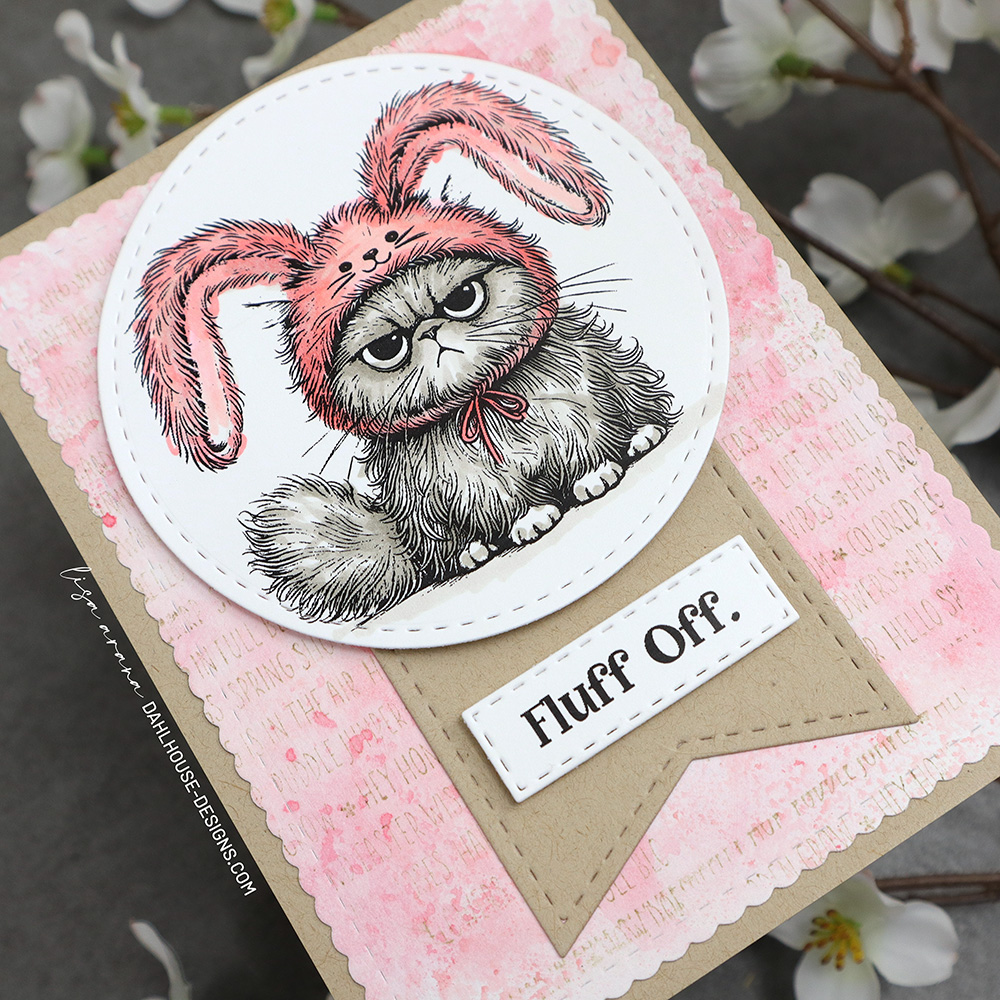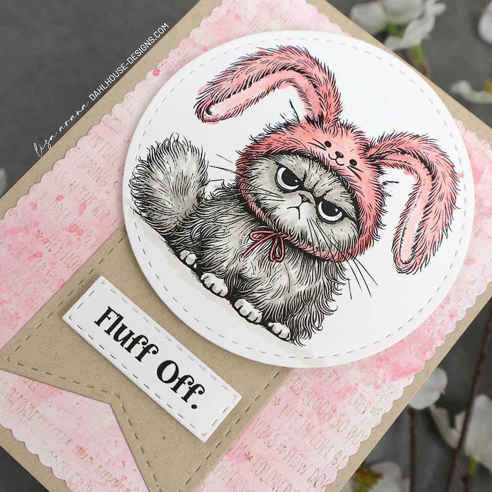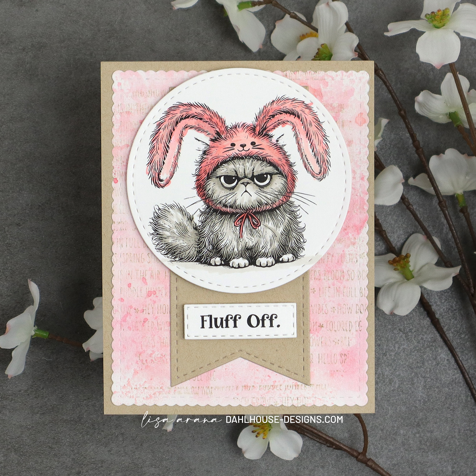 The Pissy Kitty is colored with Copic markers, bringing out all that fluffy fur texture. His ridiculous bunny hat got some extra pink shading to keep it playful. The image is framed with a stitched circle die, then layered over a simple kraft banner for contrast. The final touch is the perfectly snarky Fluff Off sentiment because it truly says it all!