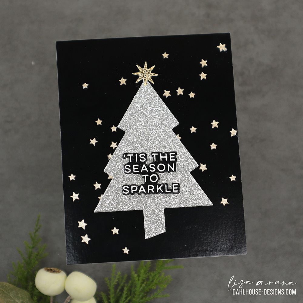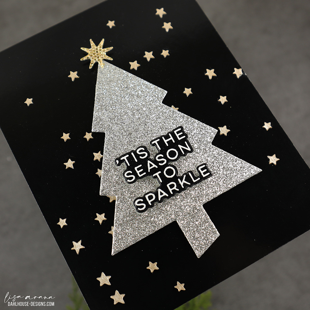 This card is all about the drama. That silver glitter tree practically glows against the glossy black backdrop, and I couldn’t resist adding a scattering of Lunar Paste stars for an extra twinkle. Nestling the embossed sentiment right into the tree keeps everything crisp and modern. It feels bold but still effortless.
