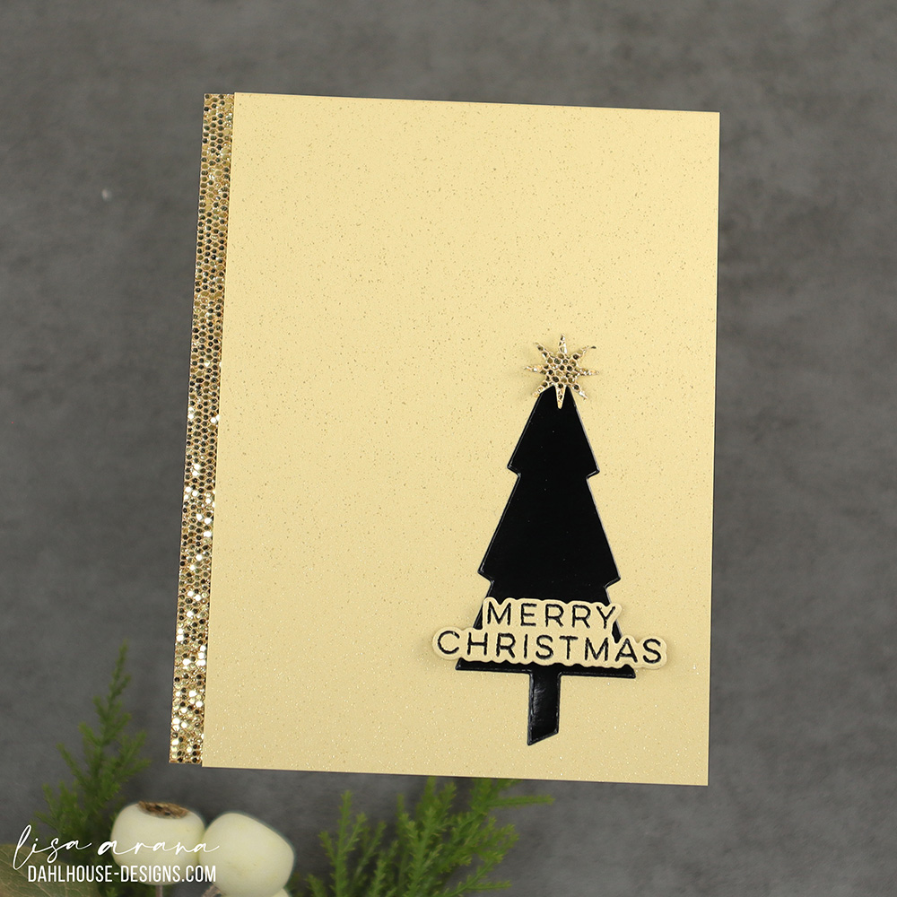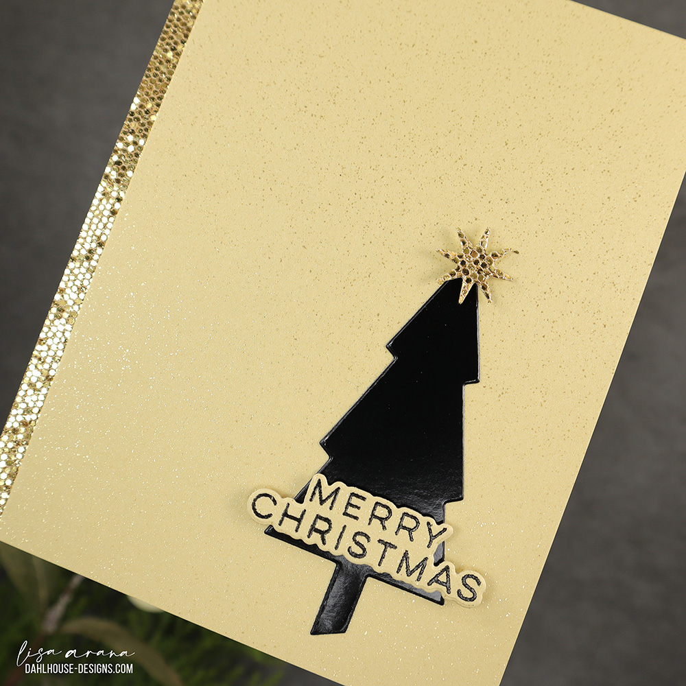 This one flips the script with a golden backdrop and a sleek black tree. I love how the glossy die cut holds its own against the shimmer, while a glittery strip down the side frames it all with a touch of glam. The popped-up sentiment adds just enough dimension without complicating the clean layout.