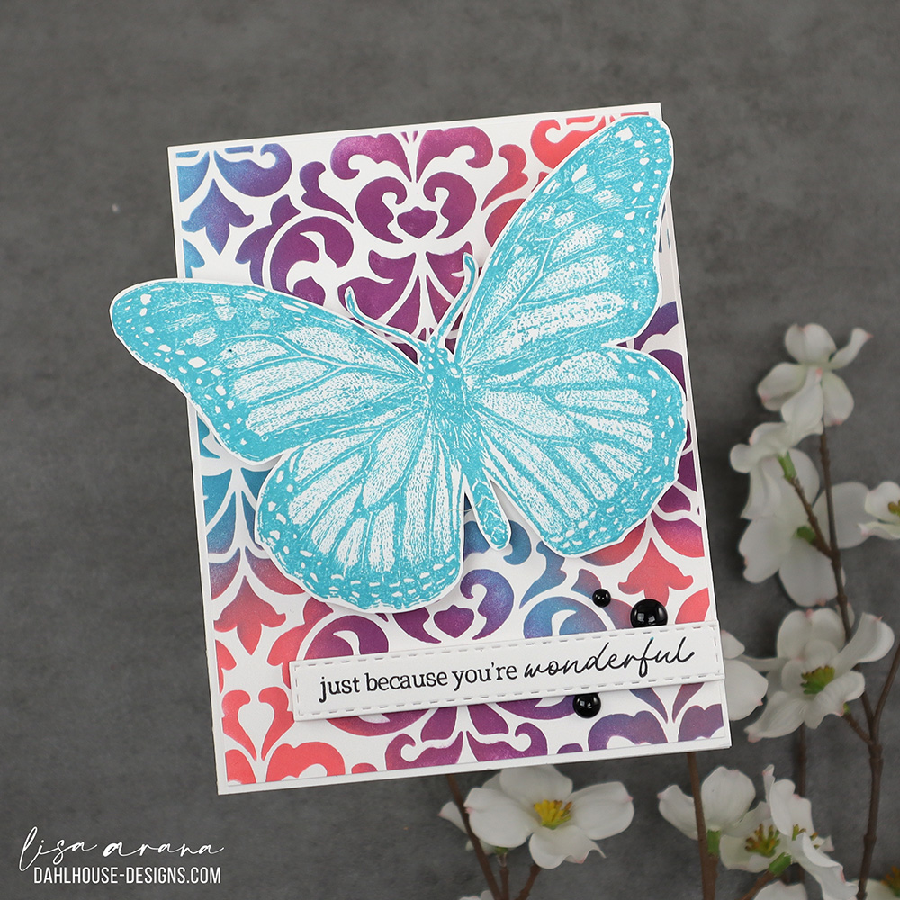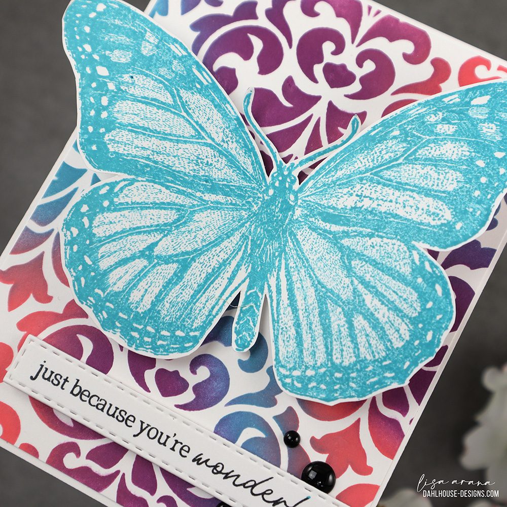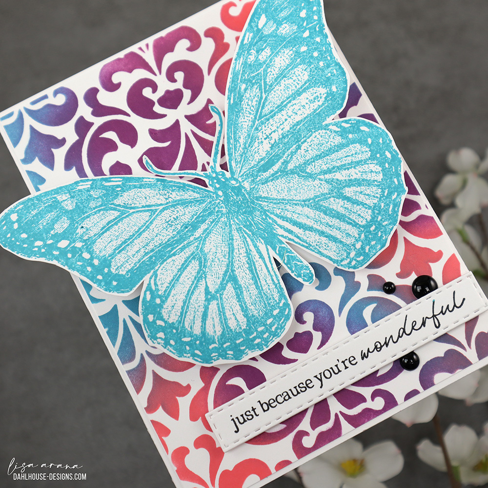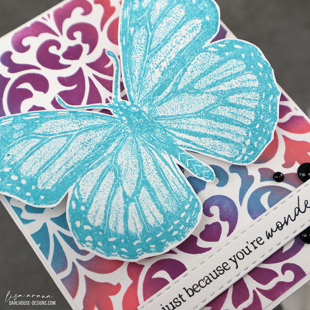 This card came together quickly with the Large Damask stencil from Unity and three vibrant Distress Ink colors. I blended Abandoned Coral, Seedless Preserves, and Peacock Feather for that bold background, then trimmed it slightly to leave a clean white border when mounted to the card base. That gorgeous monarch butterfly stamp from Unity Stamp Company is stamped in Peacock Feather, letting all those intricate details shine without any coloring needed. I added a simple sentiment and a few enamel dots to keep the spotlight on that bold, inky background.