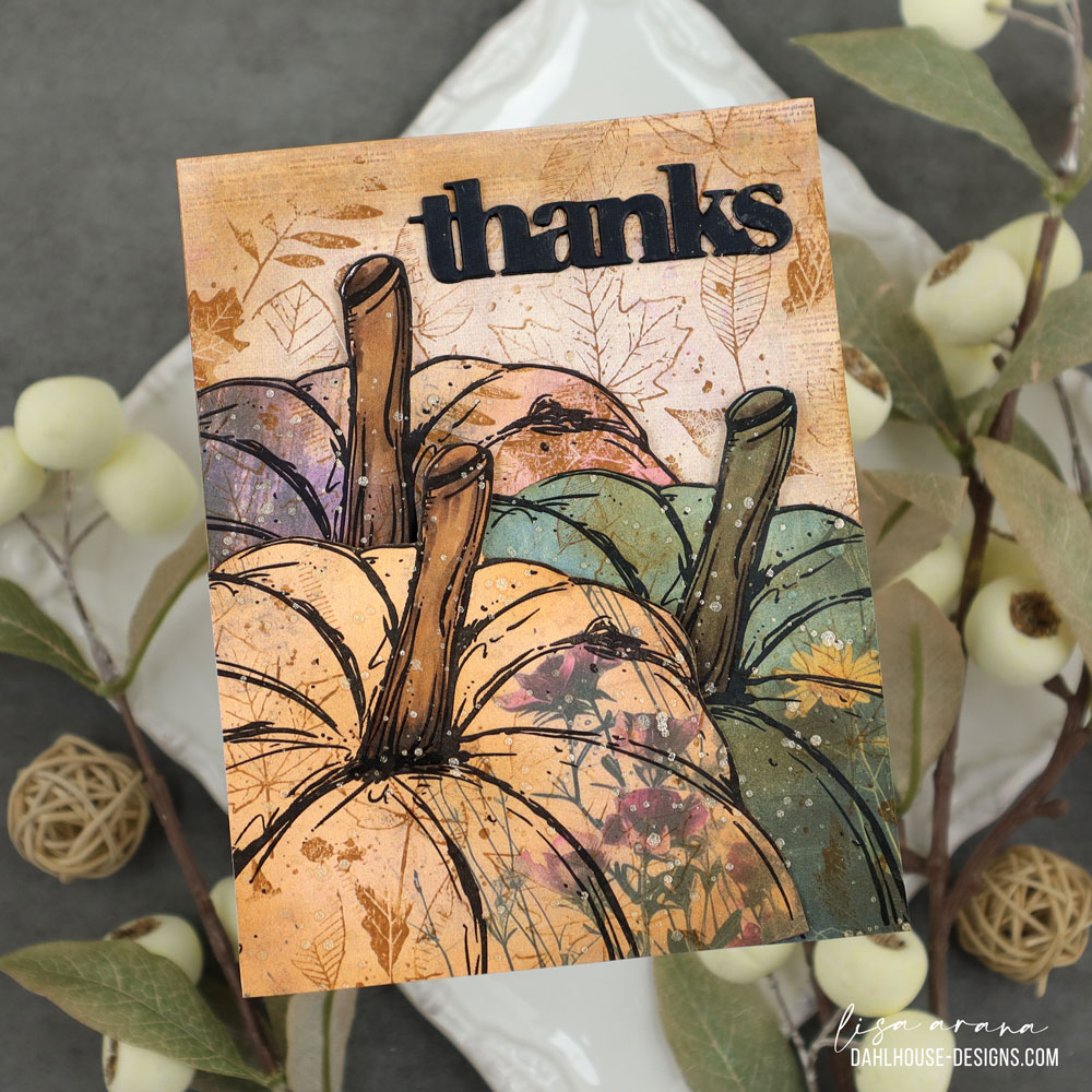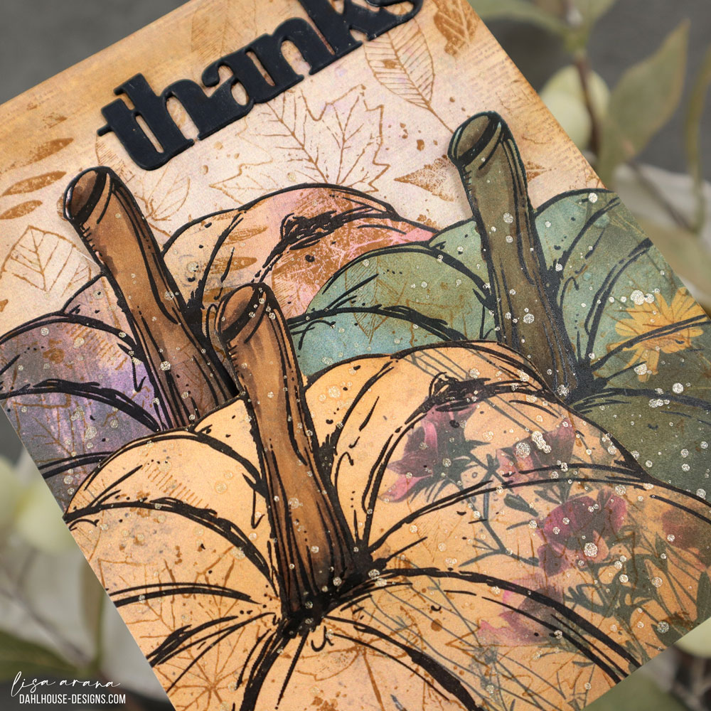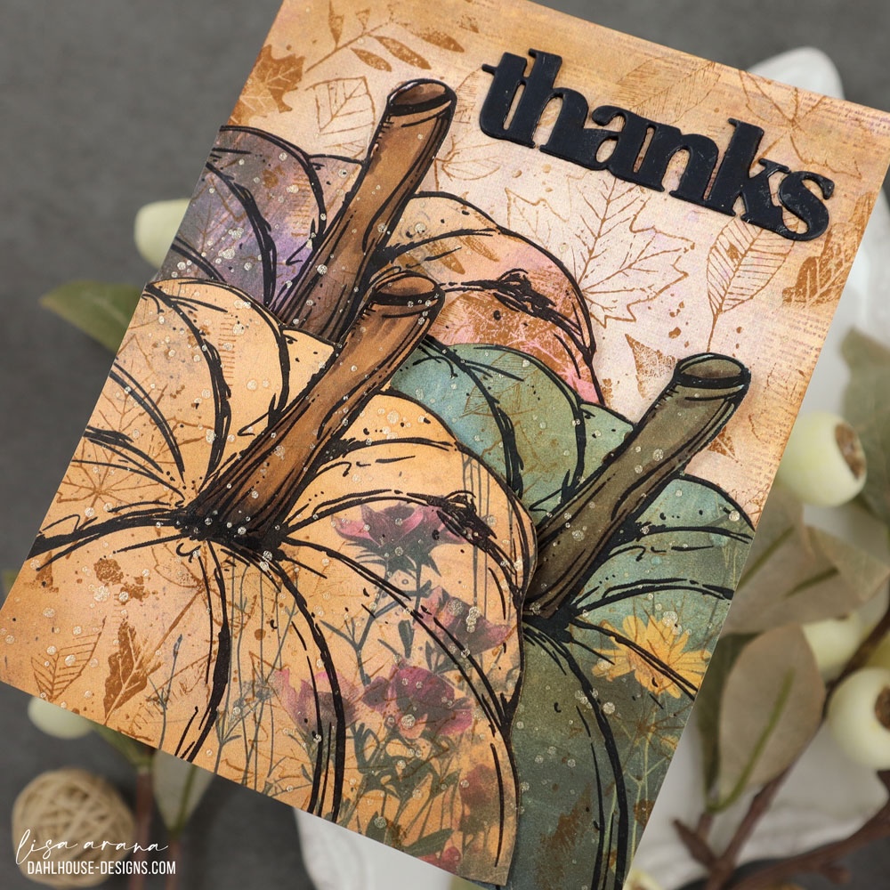 These pumpkins were stamped right onto patterned paper, and I adore the soft textures and floral details peeking through. A little ink blending and leafy stamping over the top added more depth, making them feel rich and rustic without needing much coloring except for the stems. The trio of pumpkins layers together so easily, and with the tops popped up, they look dimensional but still mail perfectly flat. The black die cut thanks ties it all together and echoes the bold outlines of the stamping.