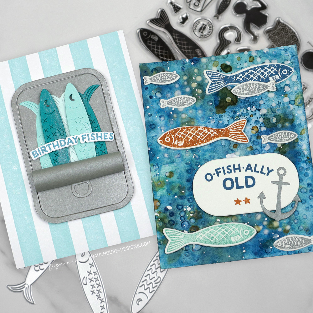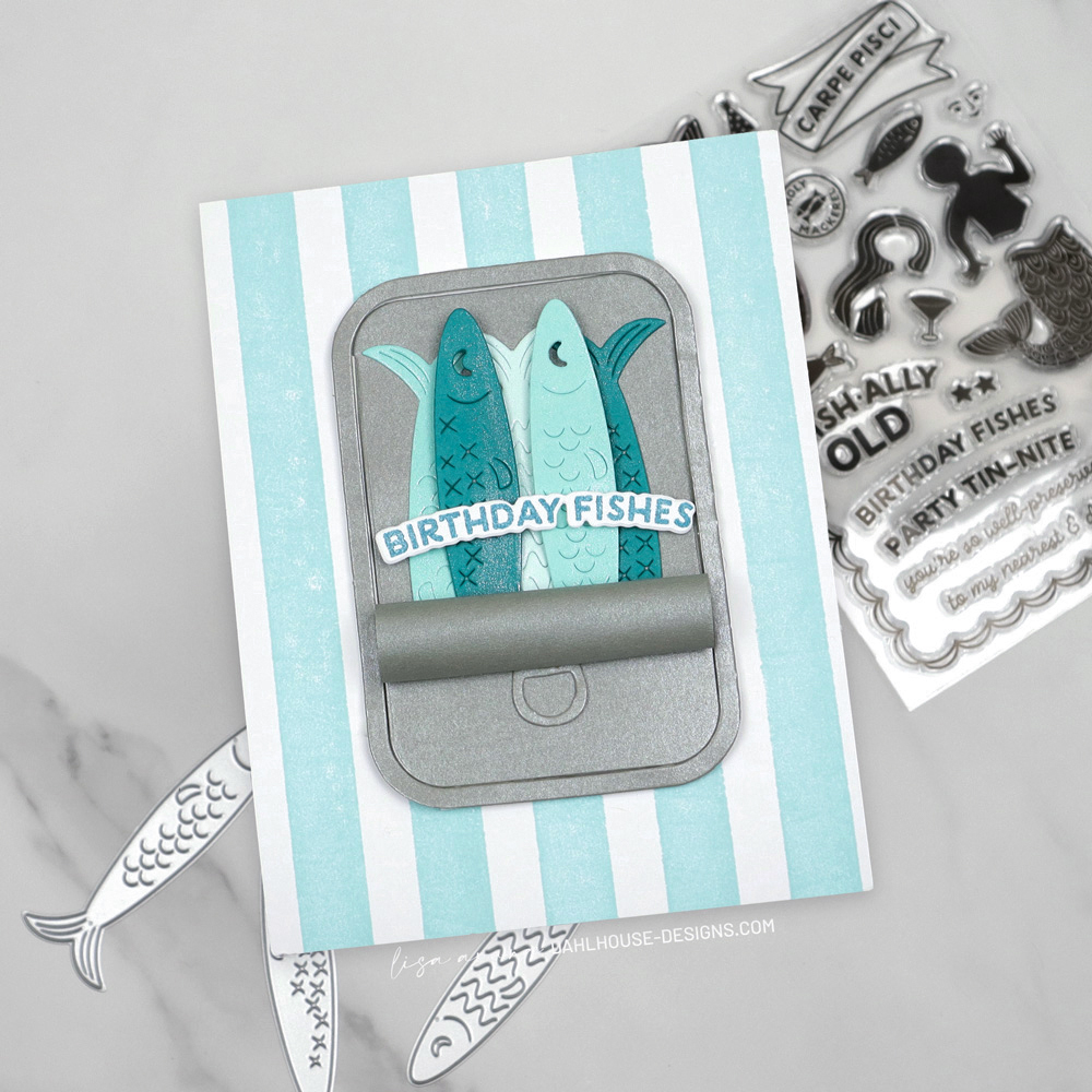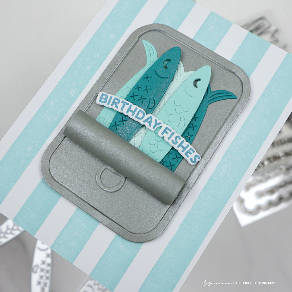 The tin was die cut from a metallic, sturdy vellum from Your Paper Insider Box 13, which gives it that realistic, can-like feel. I rolled back the top layer of the tin and recommend using a strong liquid glue to keep it in place. Then added some Nuvo Drops to the fish bellies for a subtle shimmer. The birthday sentiment ties it all together and keeps the card feeling playful and punny.