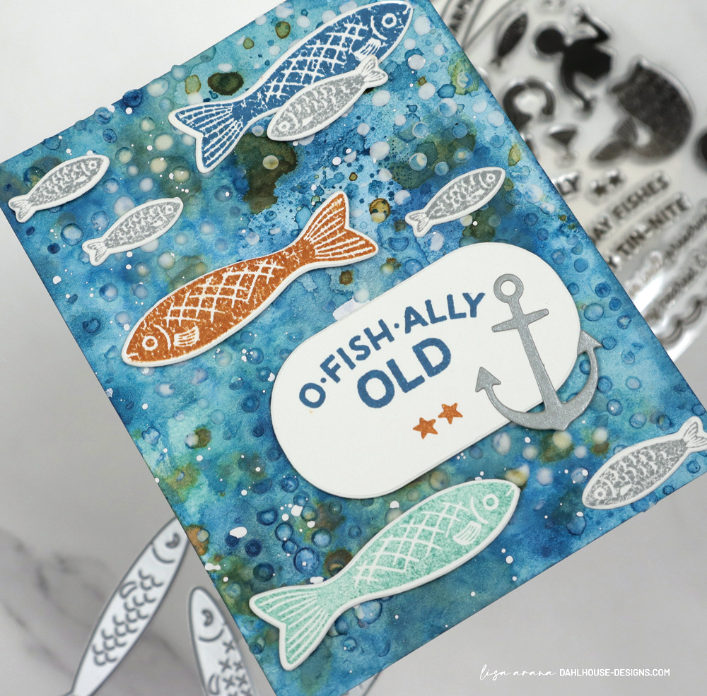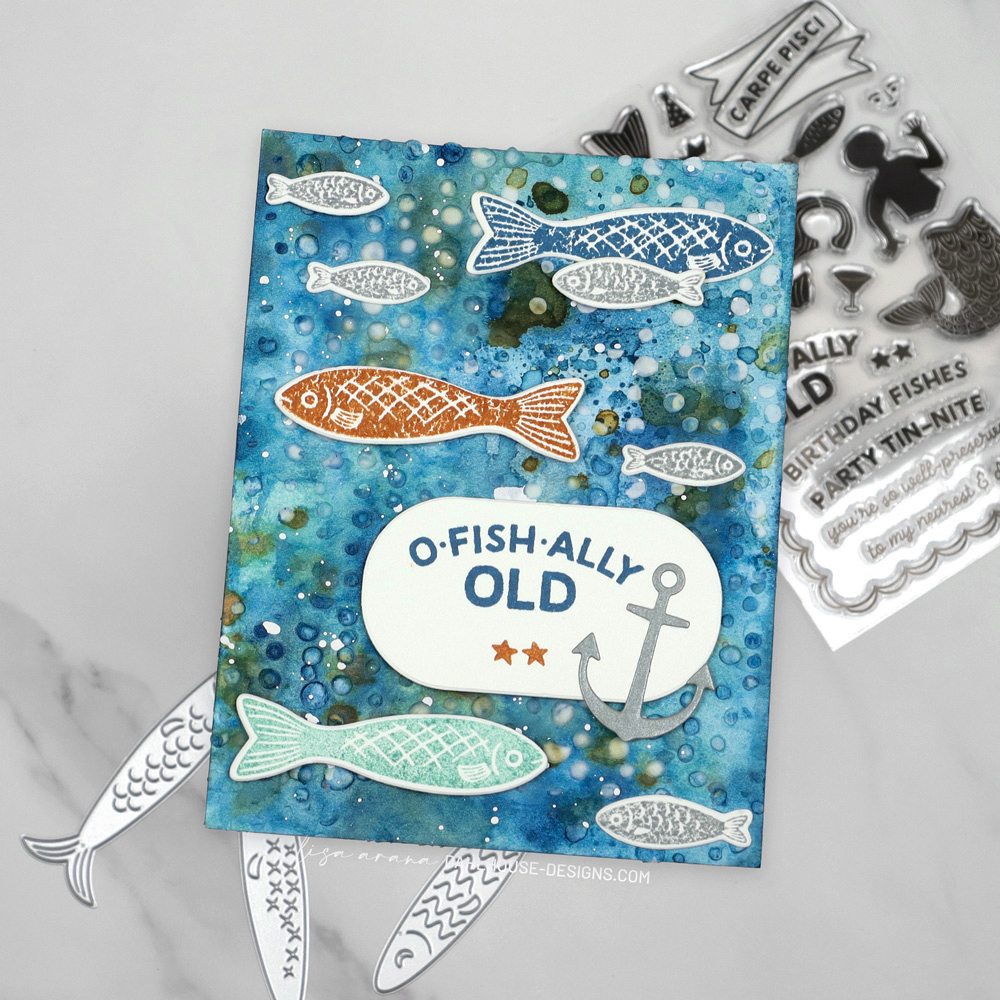 This card is all about that mixed media background and letting the ink and texture lead the way. I created a layered, watery look using Distress Inks, stenciled modeling paste, and Distress Watercolor Pencils to give everything that loose, ocean inspired feel. The fish and sentiments from the Well Preserved Stamp Set swim across the panel with a mix of flat and popped up pieces, which keeps the design playful and full of movement. I also tucked in the anchor from the Big Mouth Sardine Tin Die Set for a little extra detail. That funny birthday sentiment makes this one perfect for celebrating the older anglers in my family.