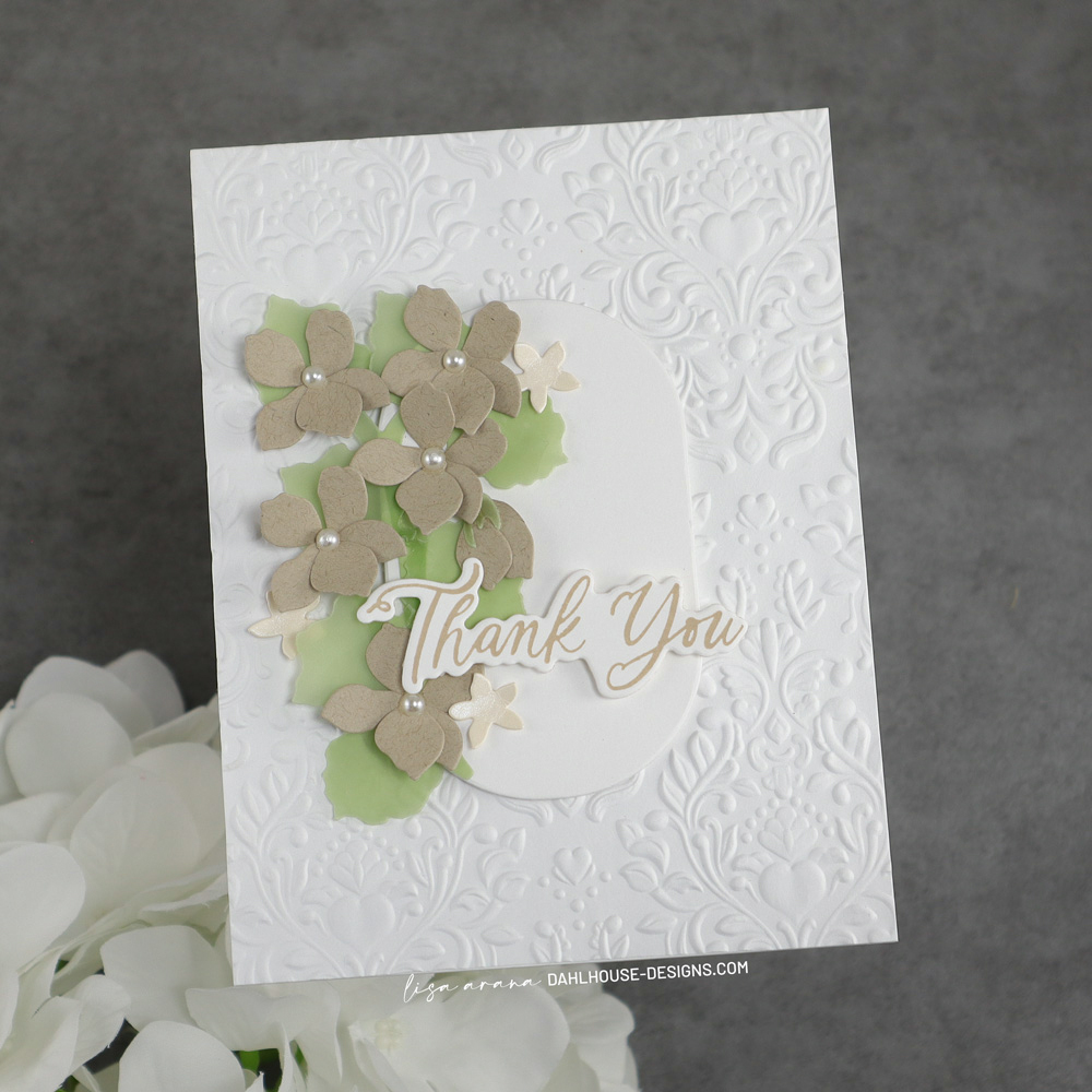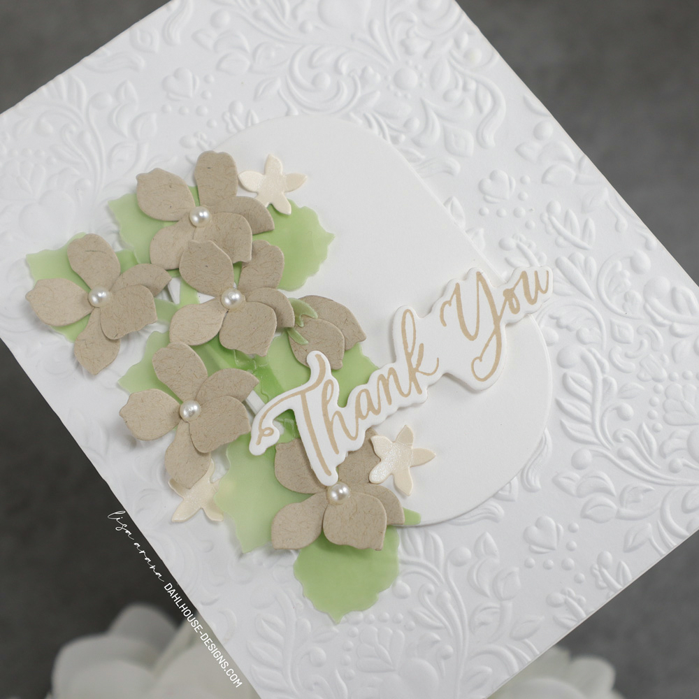 The arched die cut creates a natural focal point and frames the floral cluster beautifully. The kraft flowers from the Wild Violet and Ladybugs Die Set feel warm and organic layered over soft green vellum leaves from Your Paper Insider Box 13. Nestling the florals behind the thank you sentiment adds depth without feeling busy. Pearls in the centers finish the cluster with just enough polish.
