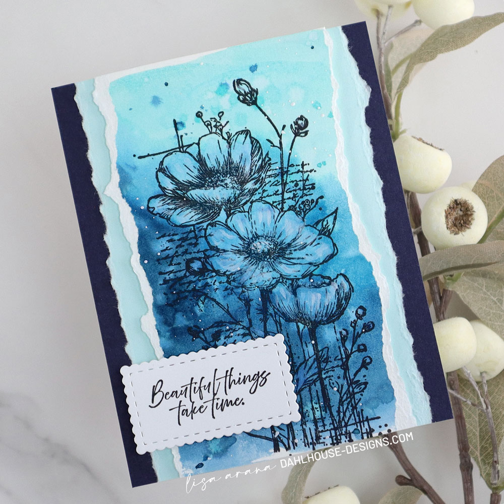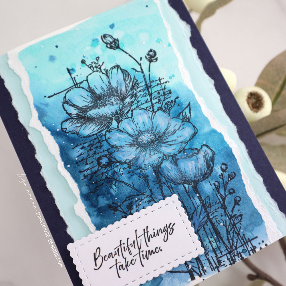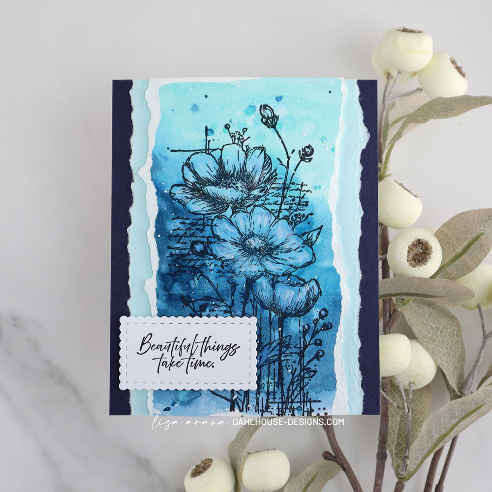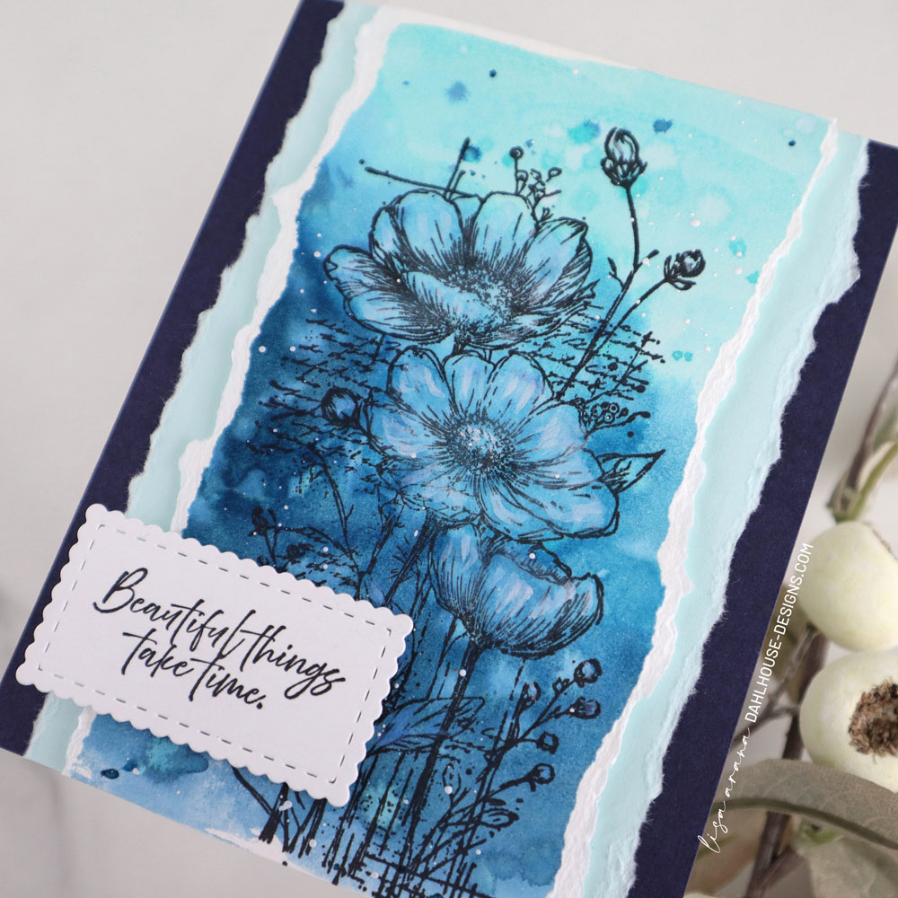 I love how this one feels moody, soft, and really pretty without a lot of effort. That easy watercolor background does so much, and the floral stamping looks so gorgeous over the top.