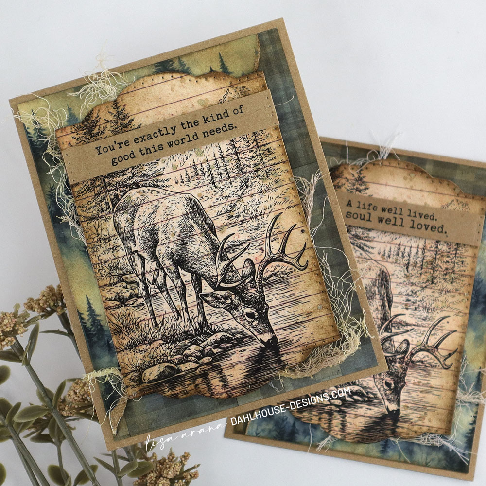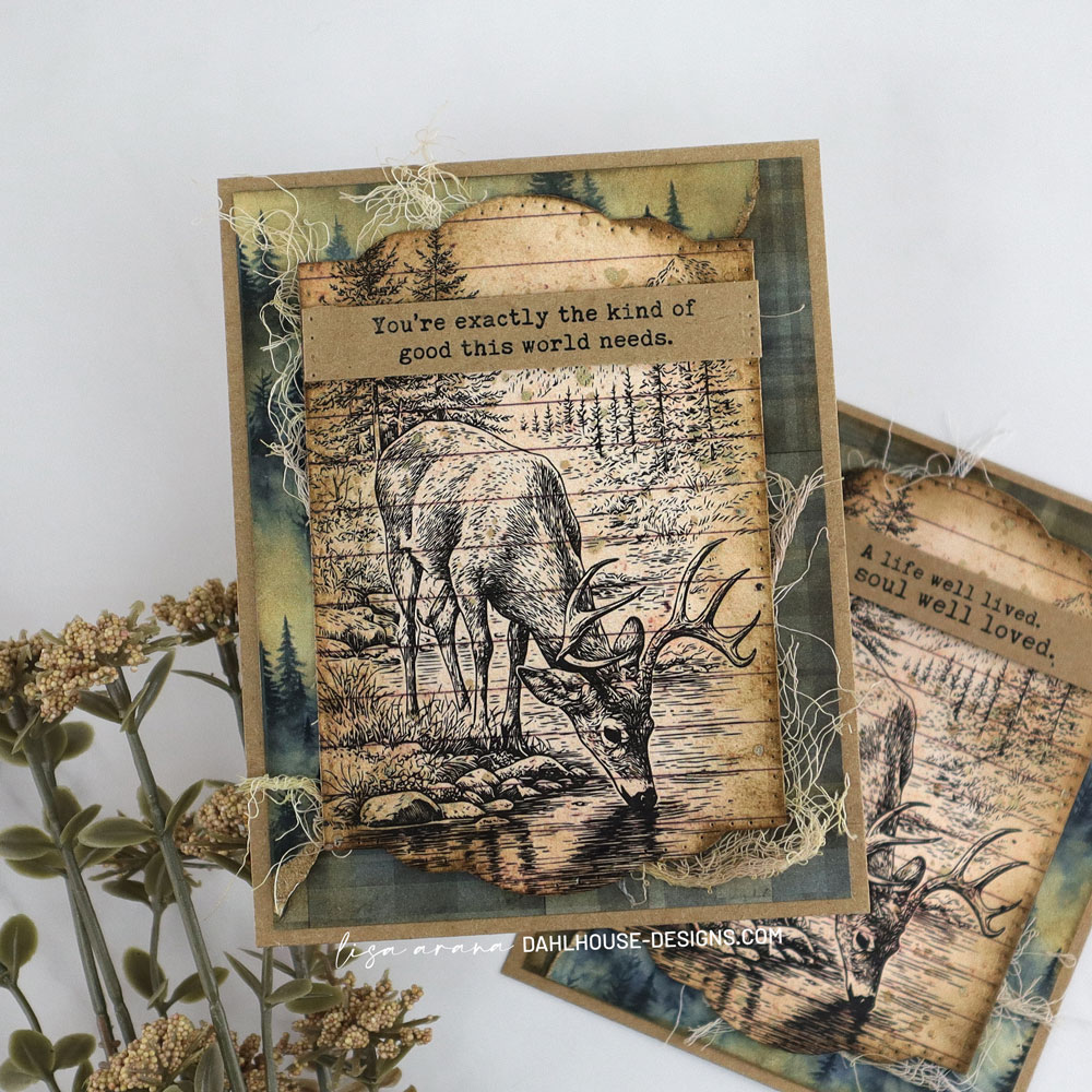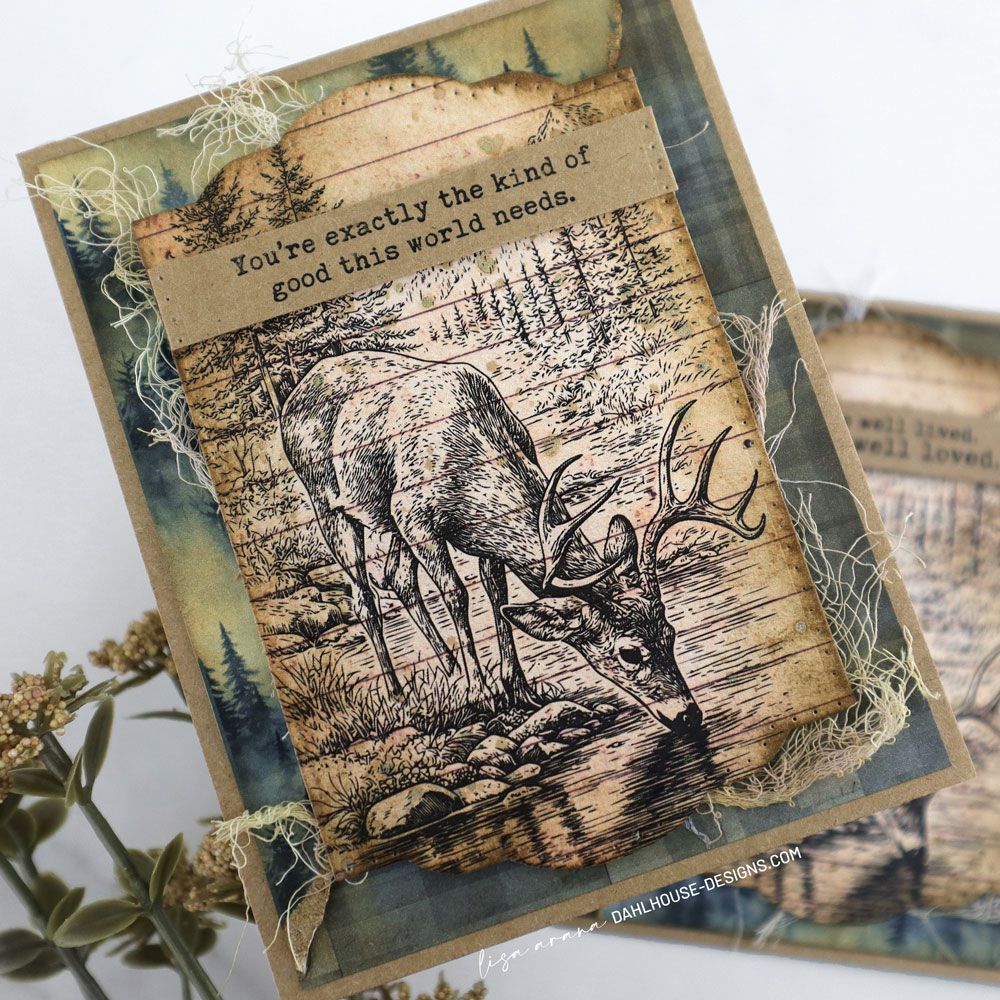 I stamped the deer scene from The Wild Haven on lined pattern paper, then die cut it into a label shape and ink blended the edges. That lined paper gives the image such a good outdoorsy vintage feel. I also splattered on mica stain and a little watered-down leftover ink from the blending, then used that same ink to dye some cheesecloth to tuck behind the popped-up label.